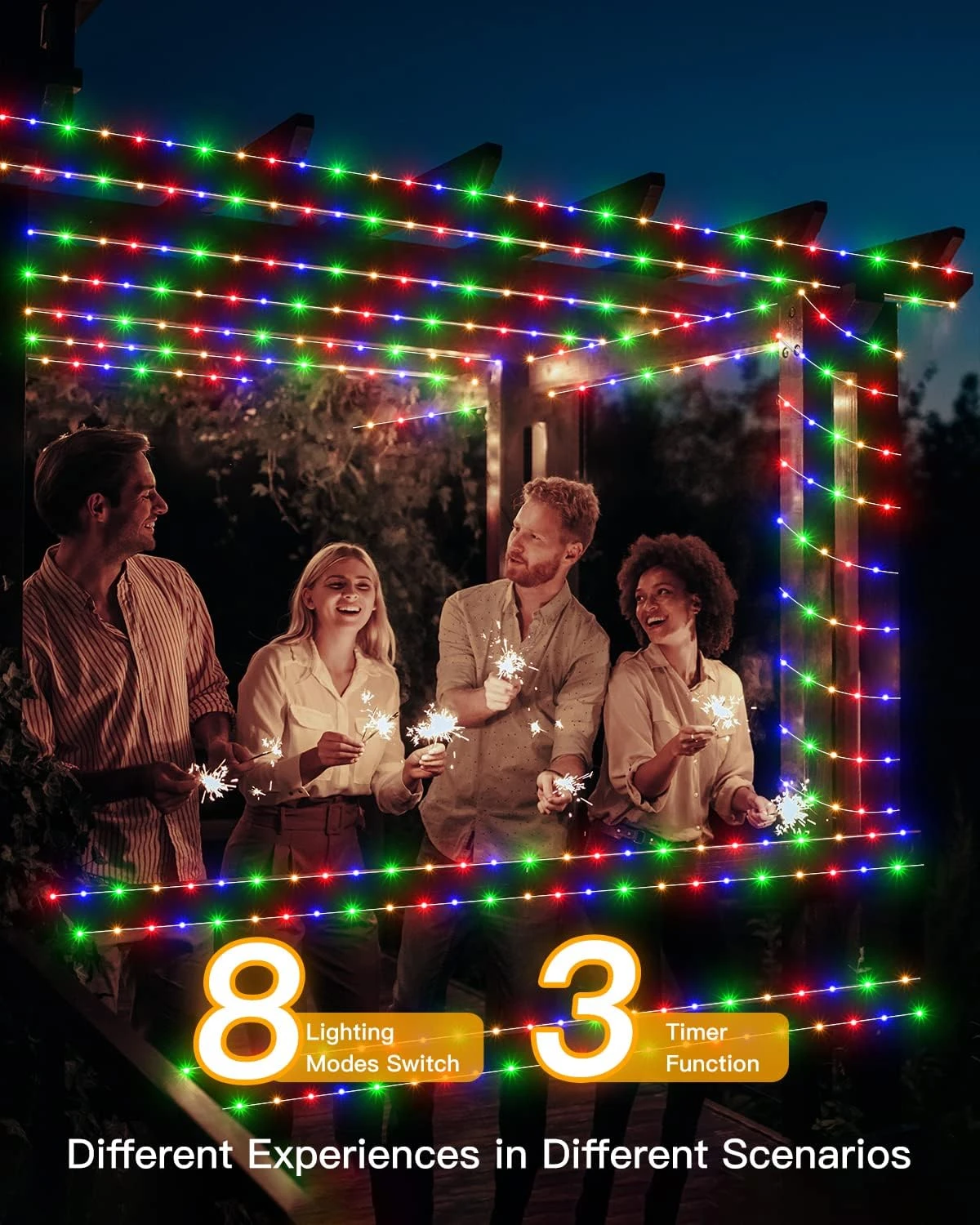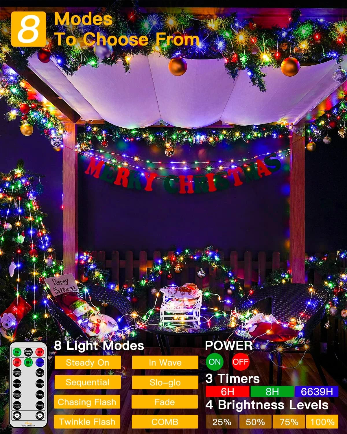 - ⭐【8 Modes&Memory&Timer Function】Our Christmas string lights are 8 lighting modes which will provide more decoration ideas for your theme party and house. The built-in memory function can save your last lighting modes. 3 timer functions to choose.4 Brightness mode(100%-75%-50%-25%).