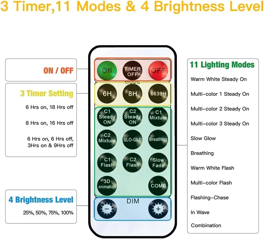 - 🎅【4 Brightness levels & 3 Timers】Dimmable: 100%-75%-50%-25%. 3 types of timers can be chosen. A built-in memory chip in string lights will save your last mode setting. Through the timer and memory function, hanging Christmas lights can light up on time every day, and no need to reset.