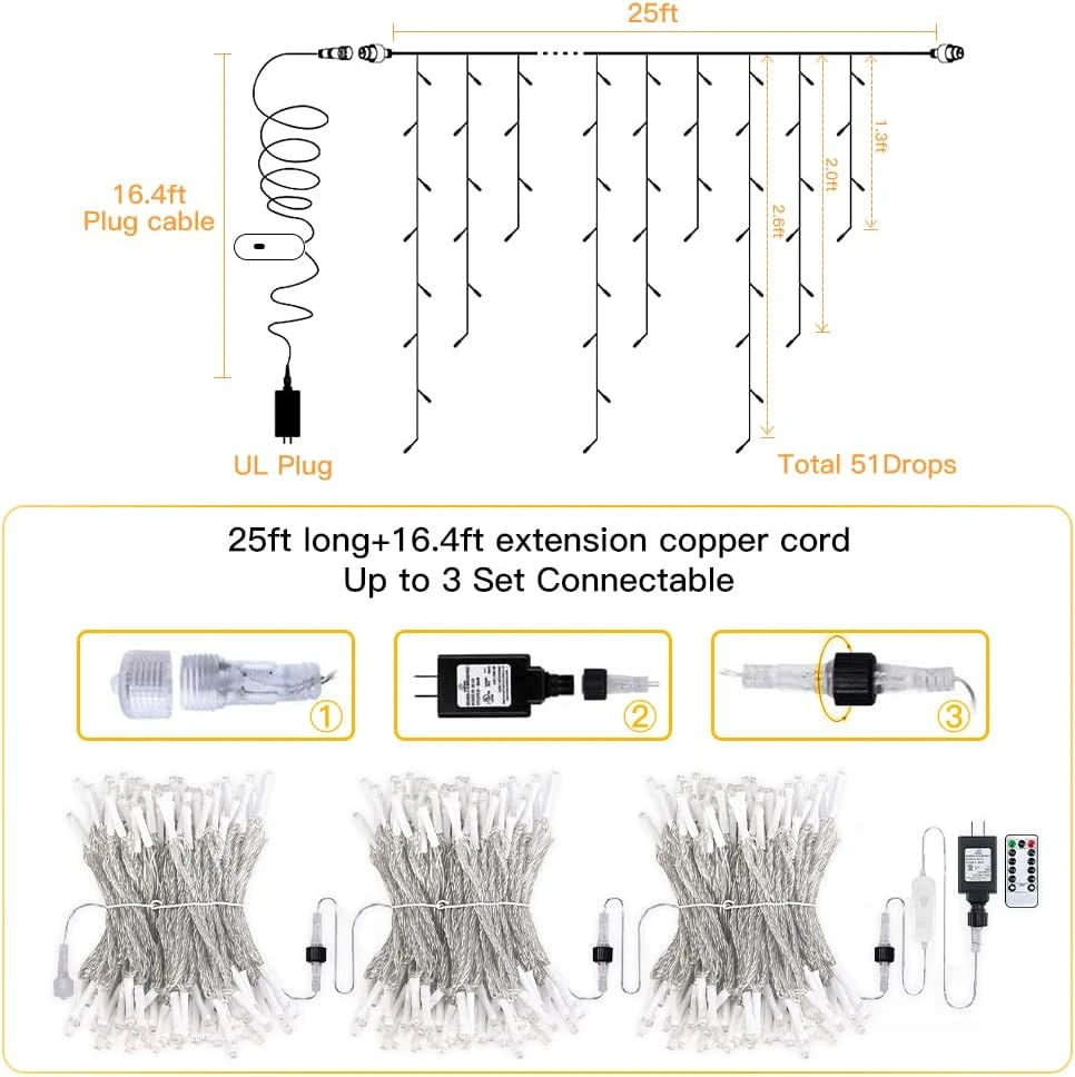 - 🎄【Connectable & Easy to Install】306 LEDs with 51 drops, 25ft long+9.8ft extension copper cord. These icicle lights outdoor are connectable up to 3 sets together via a very simple installation enough to illuminate your wider yard. Note: Connected led icicle lights can be controlled by one remote.