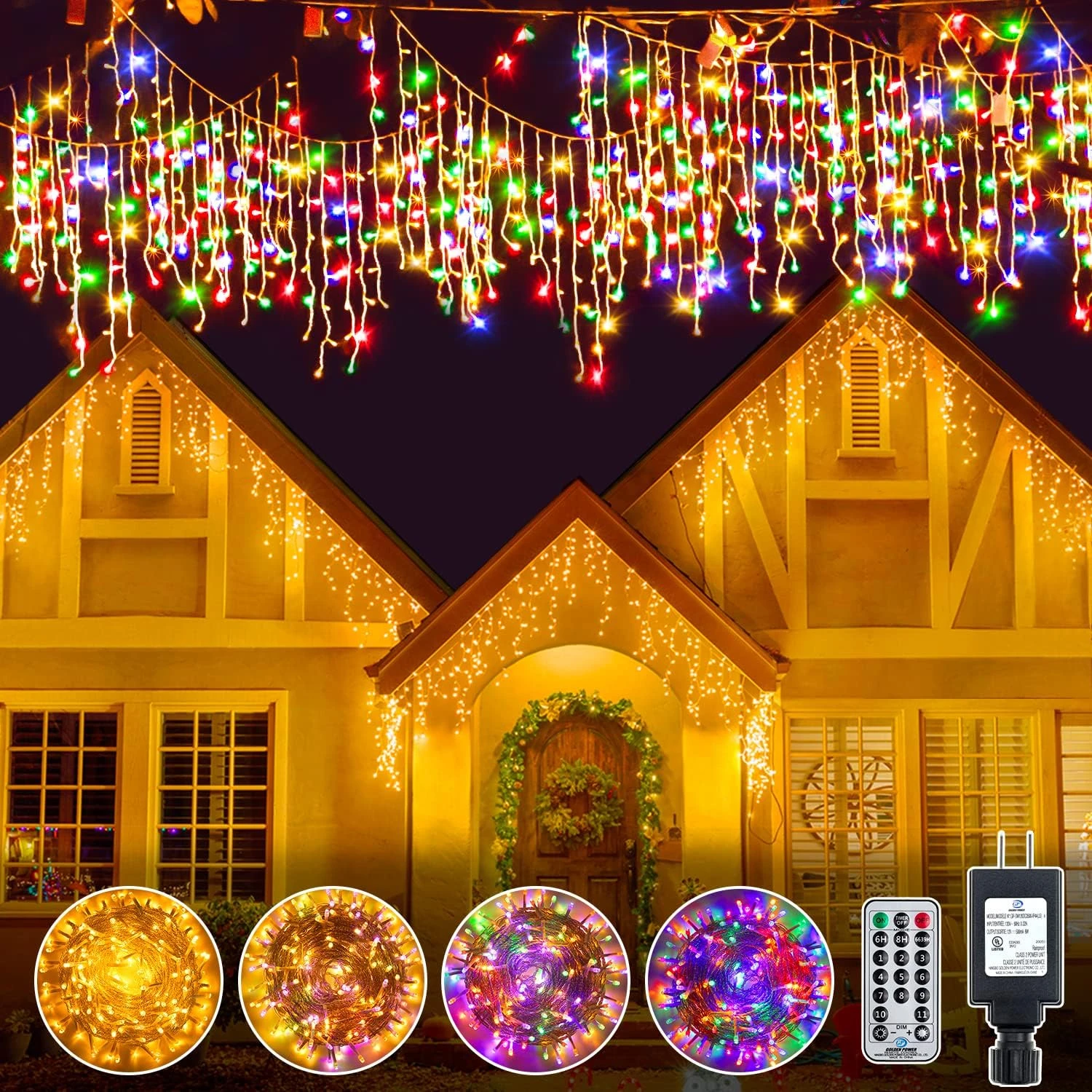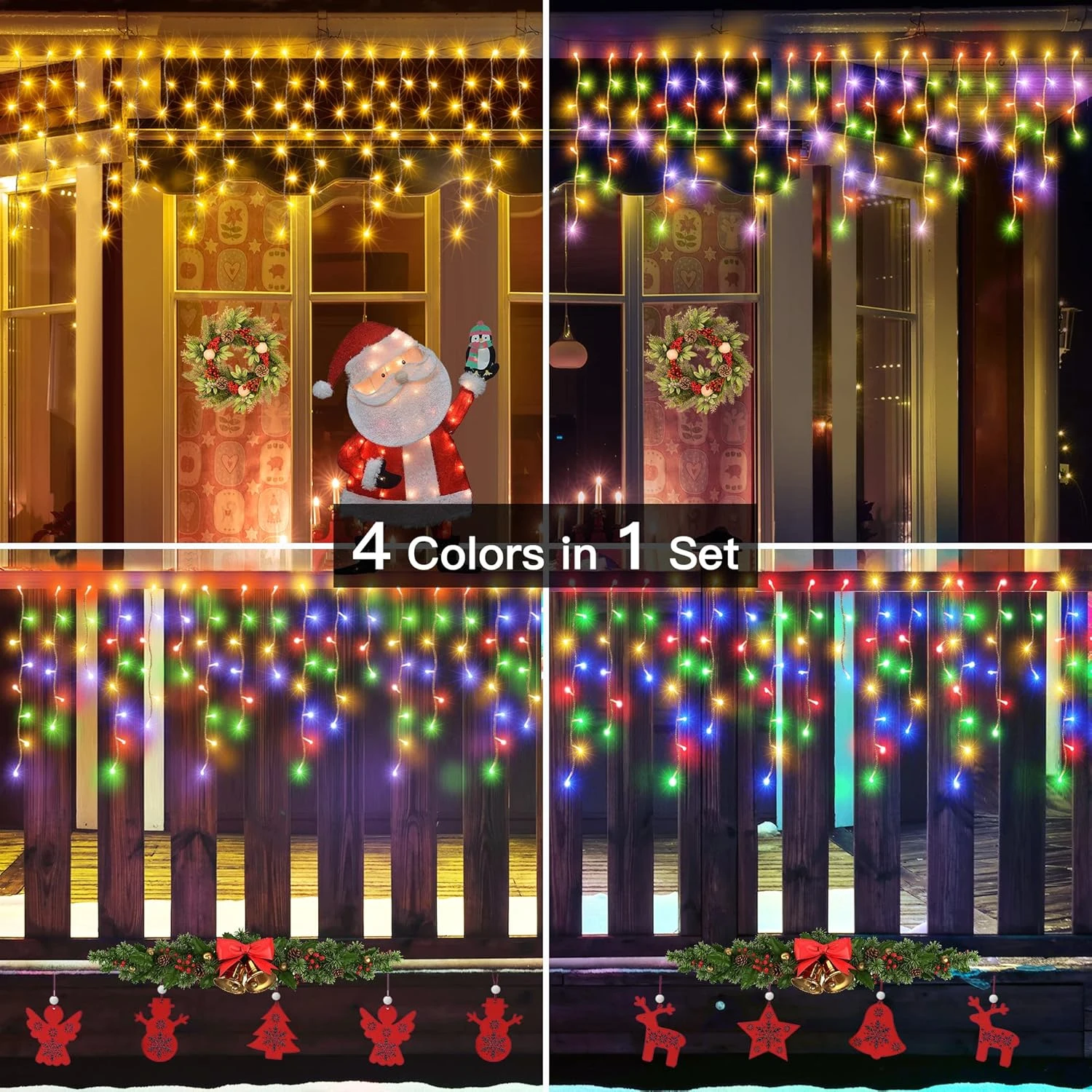 - 🎅【11 Modes with Remote】These dripping icicle lights come with 11 different modes: 4 steady-on and 7 blinking modes. From warm white to multicolor, there are 4 colors variable, and the other two are mixed colors. Buy 1 get 4! These fairy lights are the perfect decorative choice for house, bedroom, yard, patio, eave, exterior, and indoor.
