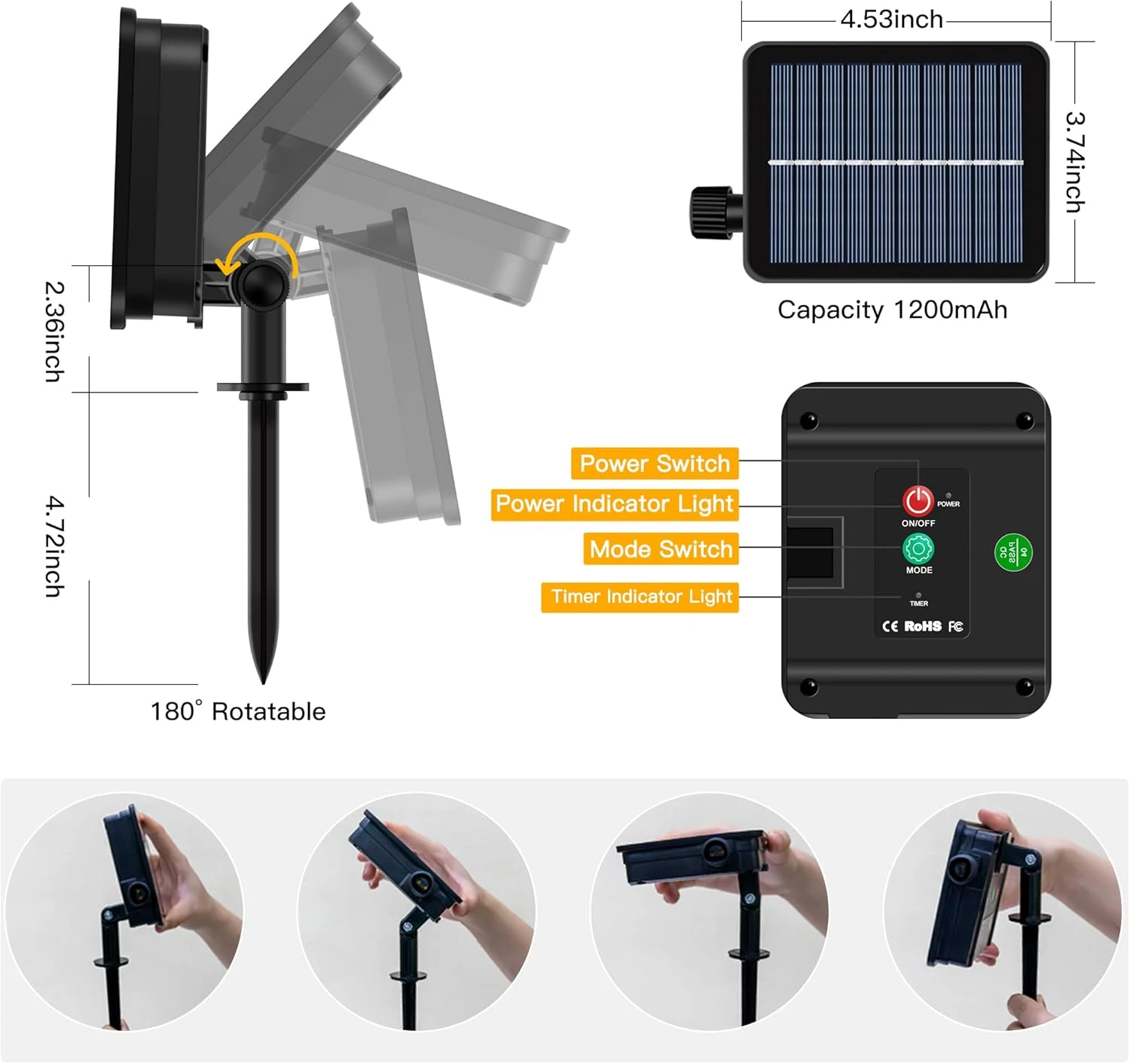 - 【Multifunctional Solar Panel Control】① 8 Modes:1 steady on ( multicolor) and 7 flashing modes (in wave, sequential, slo-glo, chasing flash, fade, light flash, combination). ② Timer Function: 3 timer function (4/6/8H) to schedule solar string lights work times automatically. ③ Memory Function: Restart solar Christmas lights will keep the last time lighting modes. Multi design can meet your more needs.