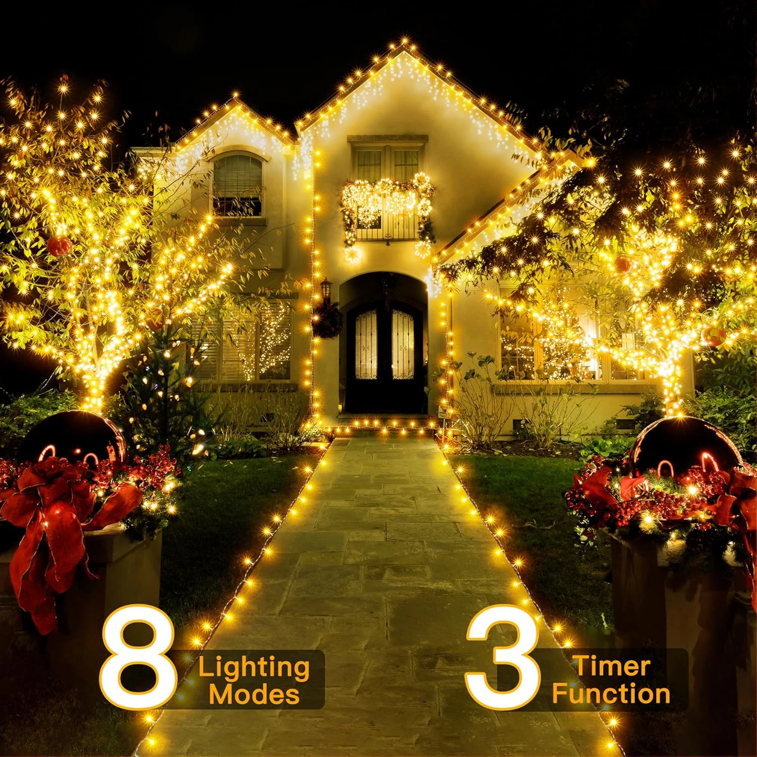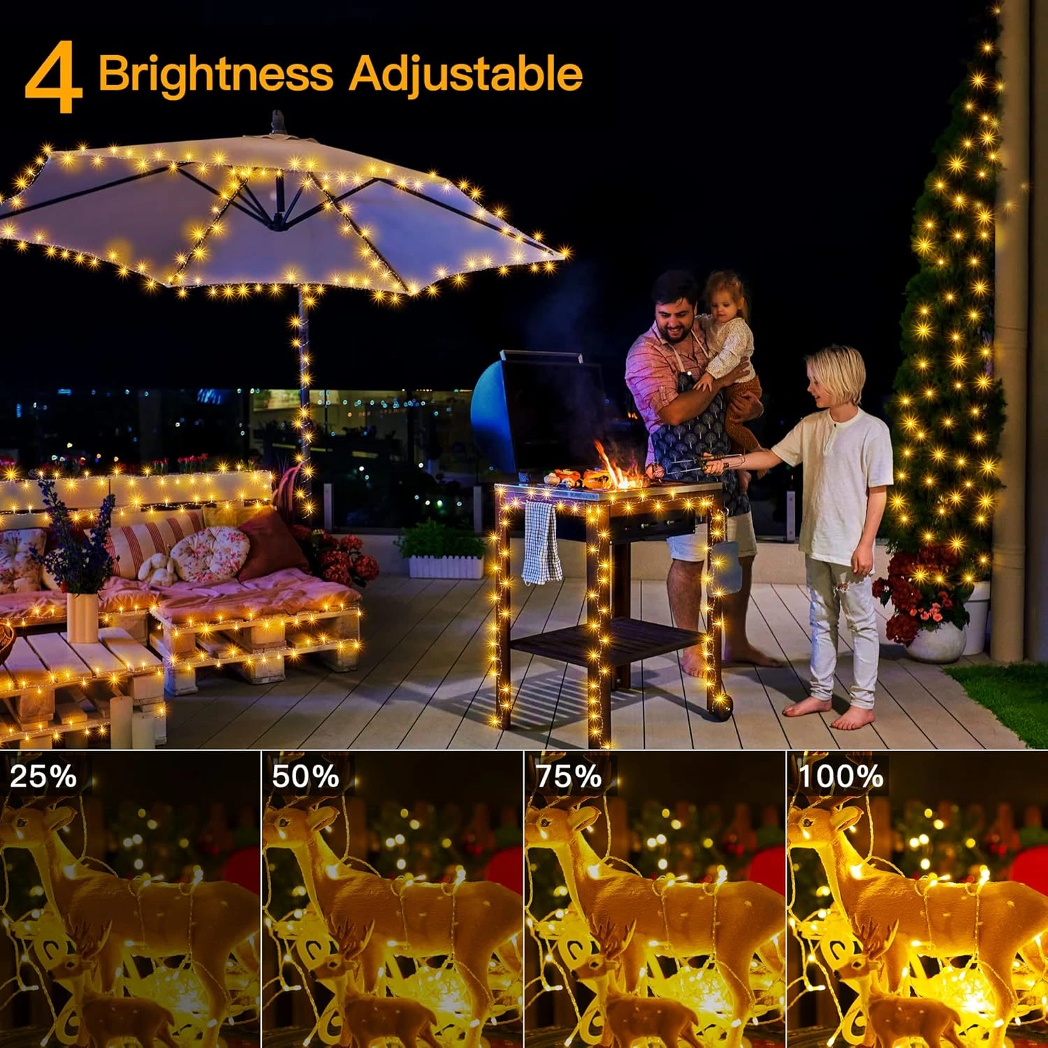 | Special Features | IP44 Waterproof: for outdoor indoor Christmas decor, Memory: keep the last light mode you set, Dimmable: 4 brightness levels(100%-75%-50%-25%), Timer: auto on/off in schedule: 6hrs/8hrs on, and 1cyclic mode (6 hrs on-6 hrs off-3 hrs on-9 hrs off). |