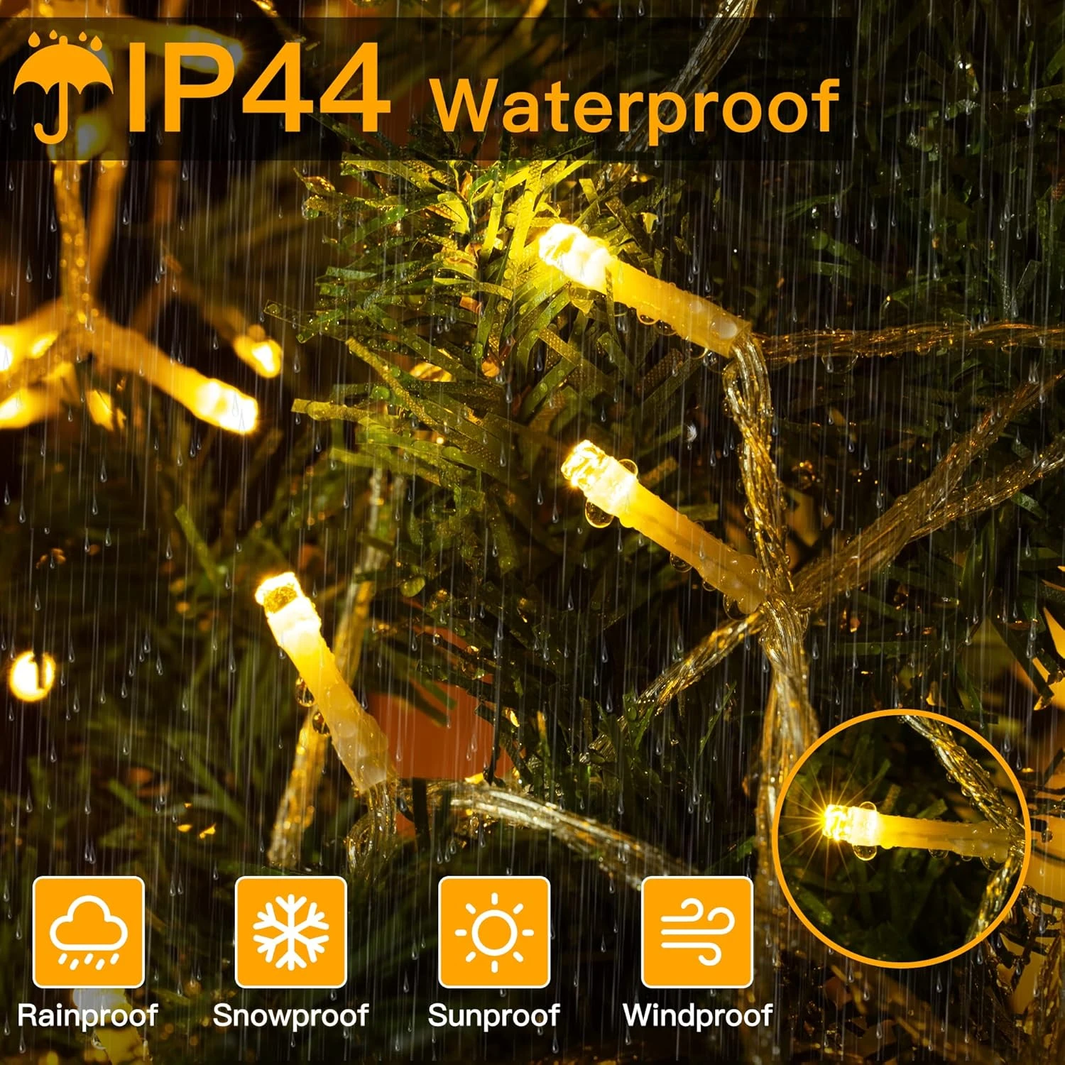 - [IP44 Waterproof Grade] Ollny outdoor lights can withstand solid objects or water soaking, suitable for indoor and outdoor holiday display needs even on rainy, snowy, or storm days. Stay lit through the cold winter or long nights