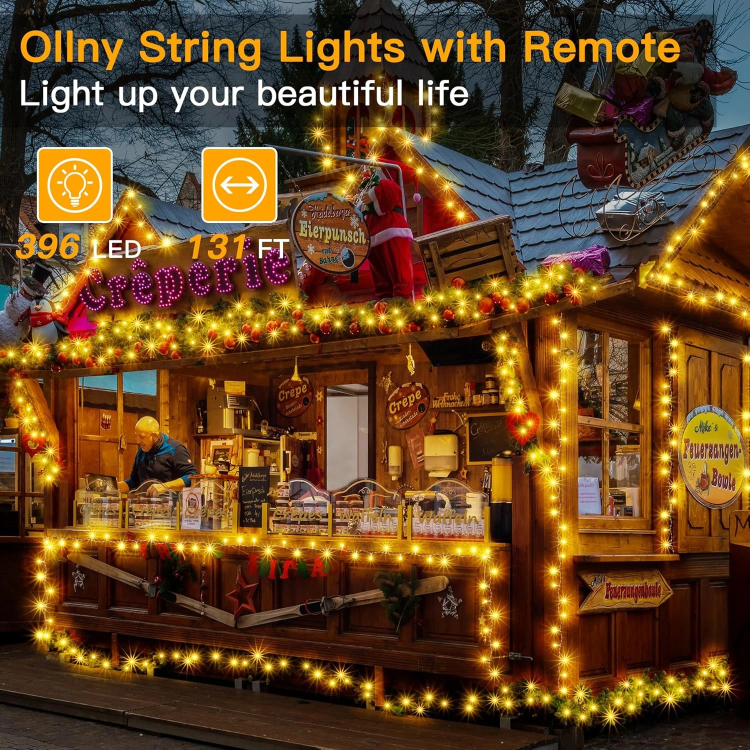 - [Total Length] Total length: 131ft and extra 9.8ft extension cord, outdoor string lights with 396LEDs lights. Ollny decor lights are long and bright enough to decorate your house, home, balcony, deck, fence, backyard umbrella bistro, apartment, dorms, cafe, etc. Extension cords make hanging lights easier to plug into outlets