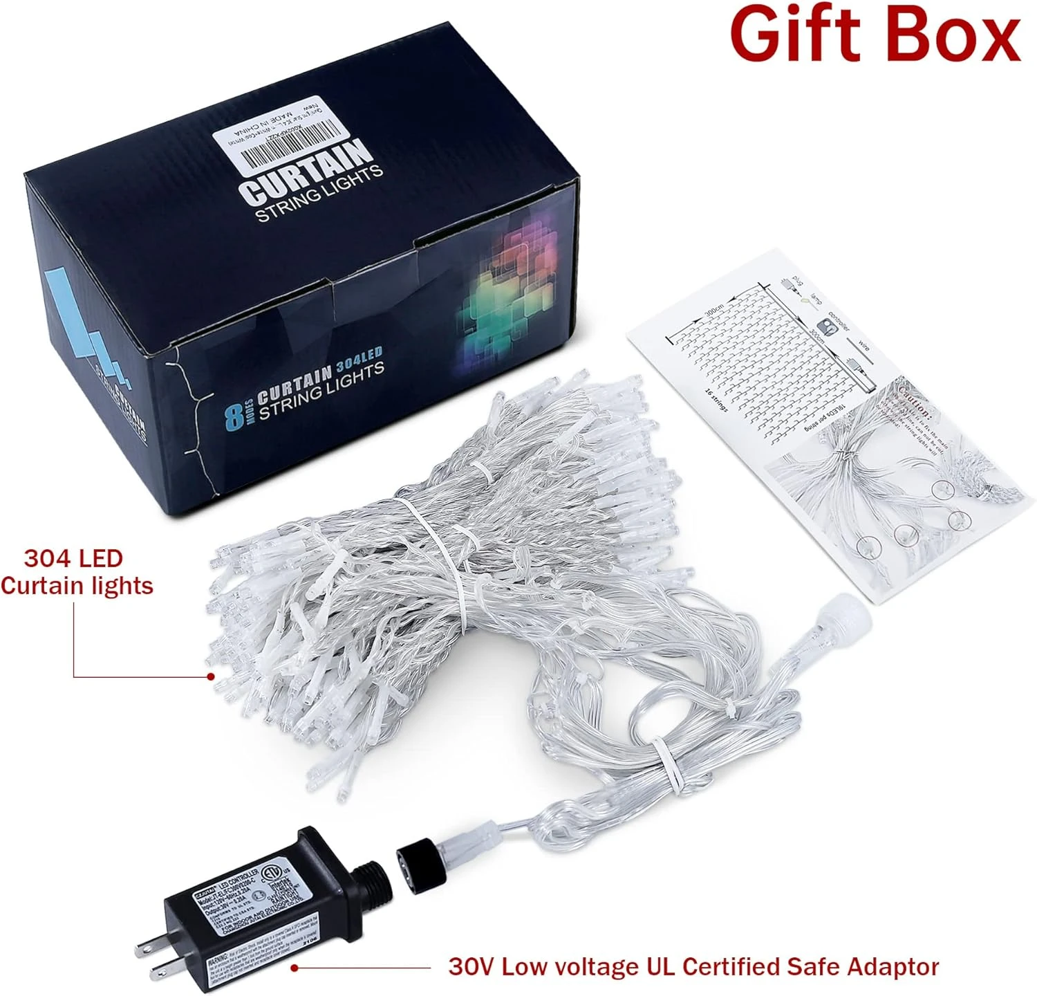 - 8 LIGHTING MODELS AND EASY INSTALLATION :The Christmas curtain string lights has 8 lighting modes for you : combination, in waves, sequential, slogs, chasing/flash, slow fade, twinkle/flash, and steady on. You can easily convert multiple lighting effect just press the button on the plug.