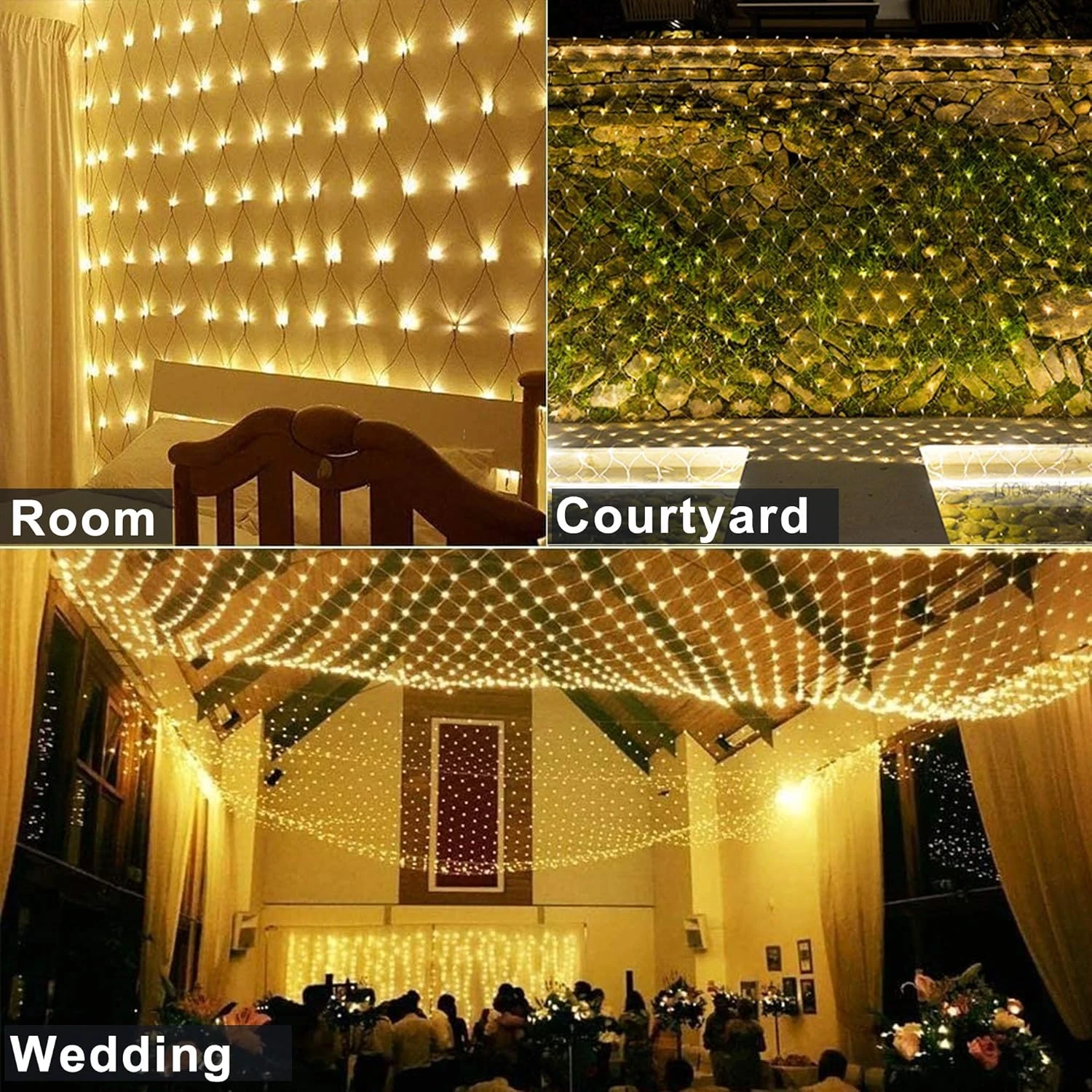 - ♥Romantic Fairy Lights Net – Our net mesh lights is a great decoration for Xmas tree, front yard, gardens, roof, ceiling, terrace and irregular bushes, and just hanging this lights net and create a romantic atmosphere for proposals, surprises, wedding, birthday, anniversaries parties, also can use for home, bedroom curtains background decorations.