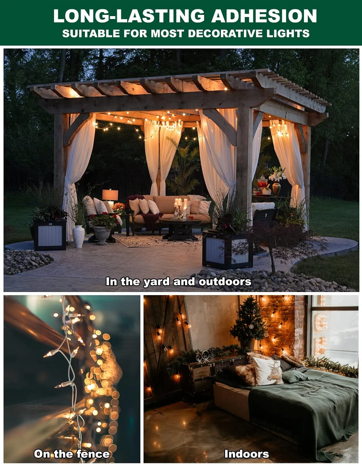 - 【Sturdy and Durable】: The upgraded clips for outdoor string lights is strong adhesion, waterproof and not affected by bad weather, whether it is high temperature or rain and snow, it can effectively fix your light string. Adheres to any dry and flat surface such as wood, metal, doors, fences, tiled windows, solid walls and tables.