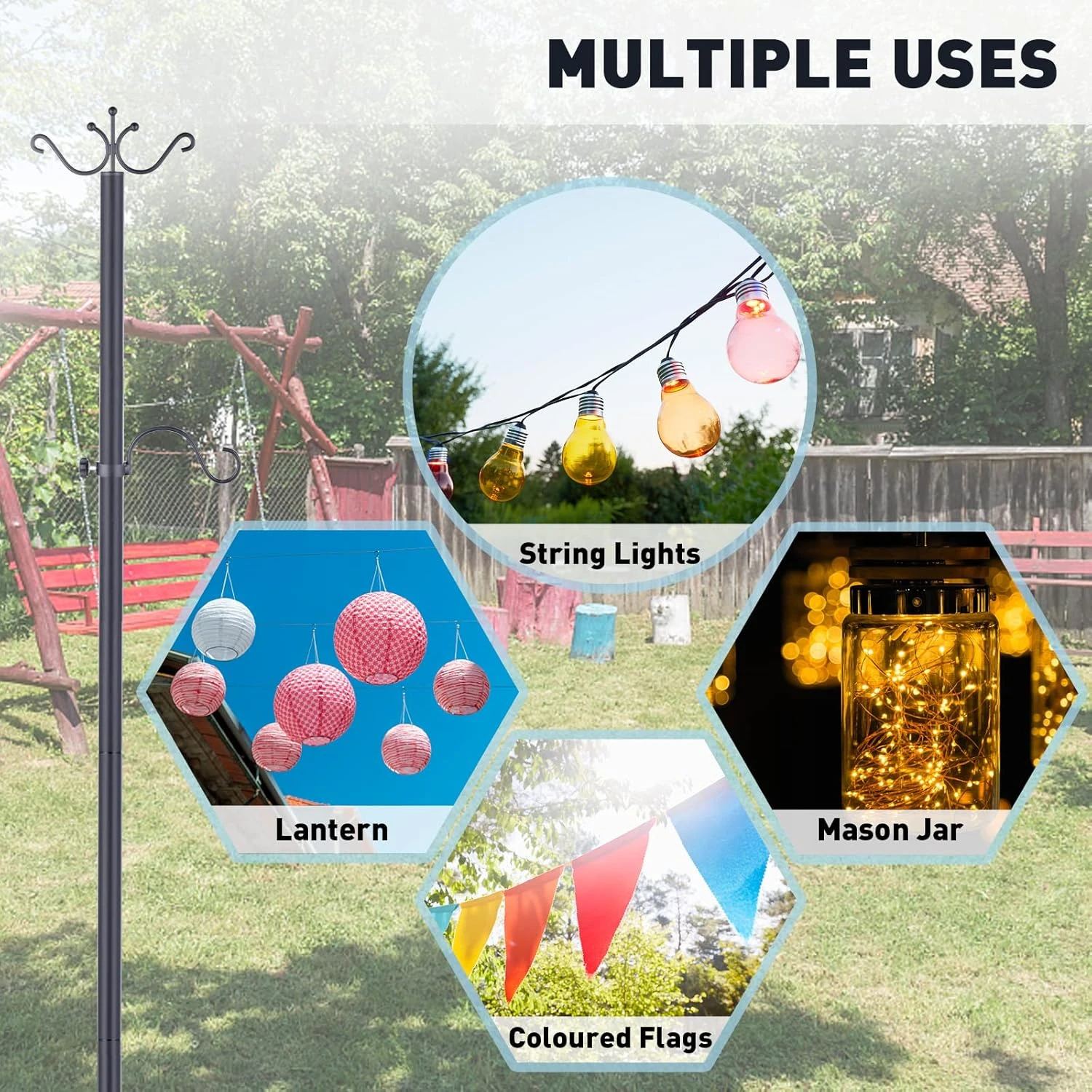 - 【Versatile and Suitable for Any Occasion】: These light poles are perfect for a variety of outdoor events and decoration needs, including streamers, lanterns, balloons, bird feeders, and garlands. They are suitable for use in any outdoor setting, whether it’s for a backyard party or a romantic outdoor dinner. The poles also come in different sizes, with the bistro light poles distance being 12ft-15ft for lightweight lights and the cafe poles distance being 6.5ft-10ft for heavy lights.
