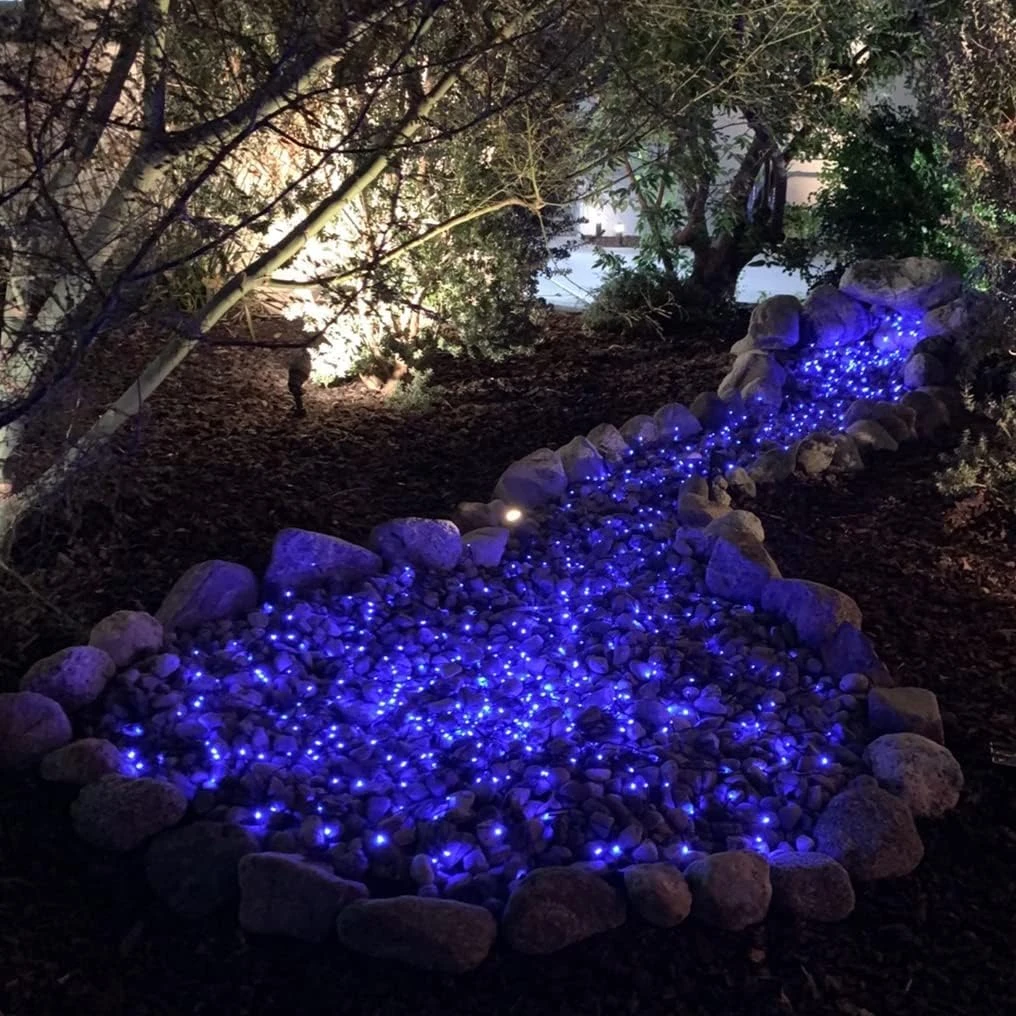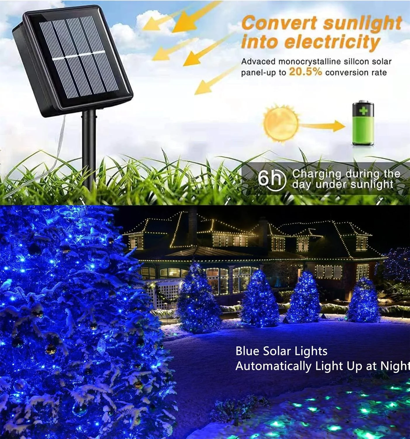 - High Efficiency Solar Powered Blue Lights & Auto On/Off: Solar energy supply, no extra utility electric cost, and no need to replace the battery. Light sensor controls the blue solar string lights auto on at dark and auto off at daytime. This outdoor string lights can work up to 10 hours or more when fully charged.
