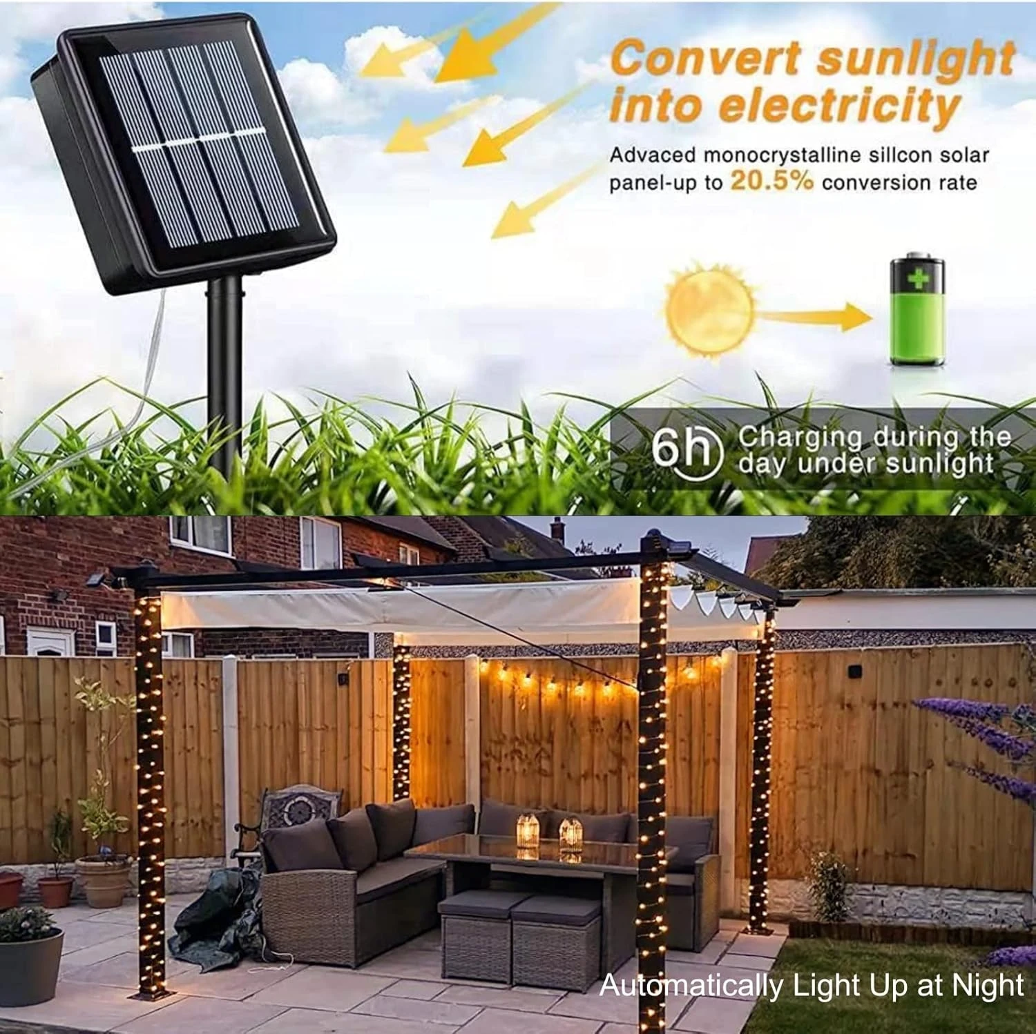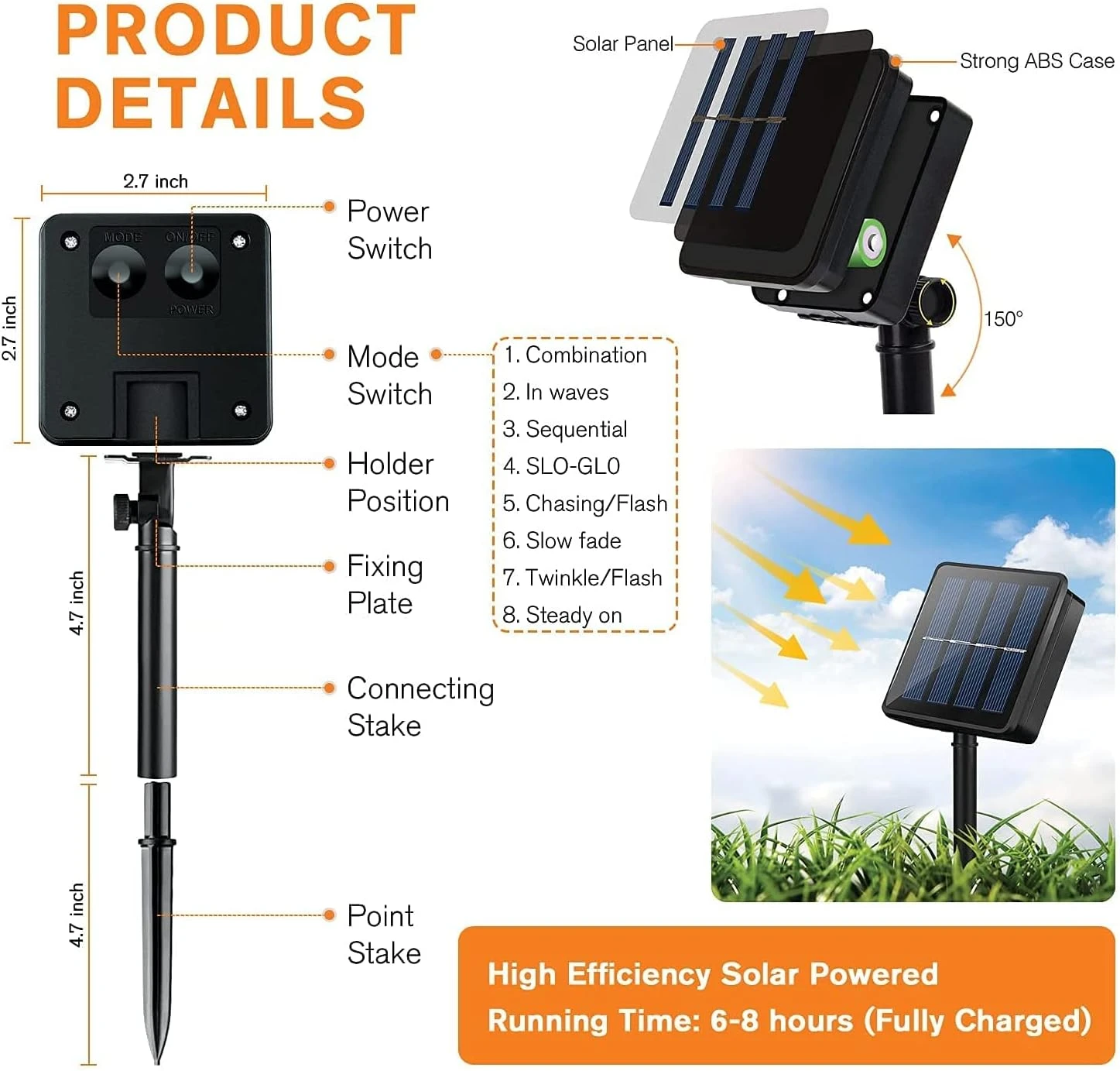 - 8 Impressive Lighting Modes: There are 8 different settings on the back of the solar panel to creates a dreamy feeling and your garden looks like a enchant fairy land at night. Solar fairy lights are an amazing addition to your yard, create a pleasant mood for events, parties or weddings