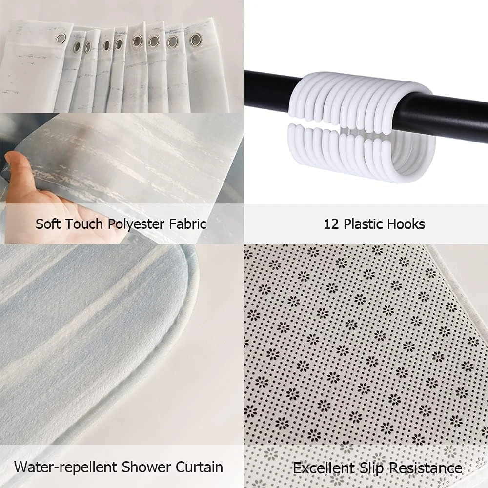 - 【MATERIAL】 Four-piece cartoon Christmas shower curtain set, the shower curtain is made of waterproof Oxford cloth, which is soft and delicate, and the rectangular floor mat,U-shaped floor mat,toilet seat cover are made of coral fleece, which is super absorbent , quick-drying, non-slip and durable.