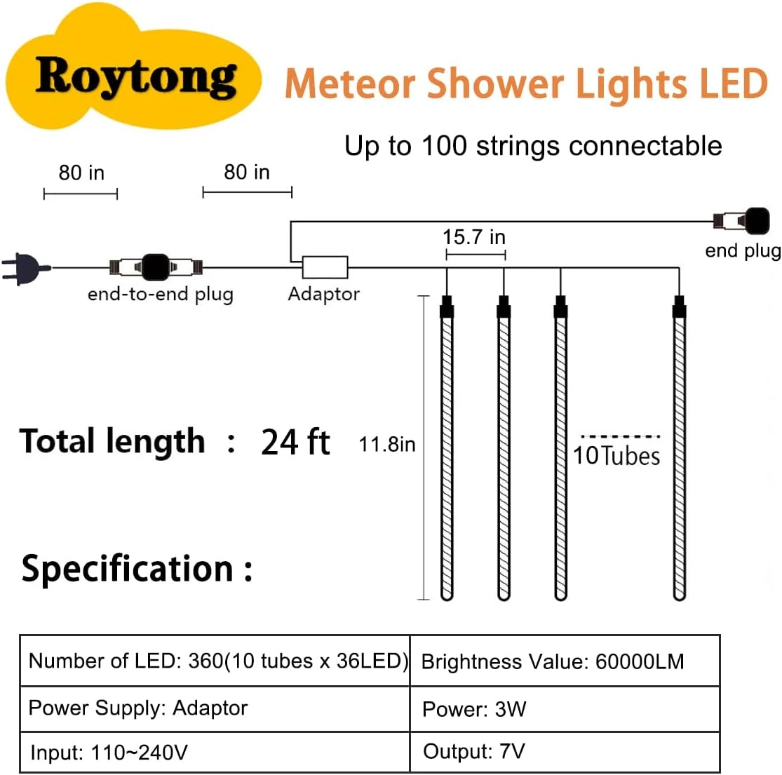 - ✅【SPECS and Cable】 Number of LED bulbs: 10 tubes x 36 LED. Tube length: 12in / 30cm. The length from the plug to the first light is 4m / 13.1ft. The distance between the lamp is 40cm / 15.7in. The total length of lamp is 3.6m / 11.8ft. For more string light information, please check the 7th picture.