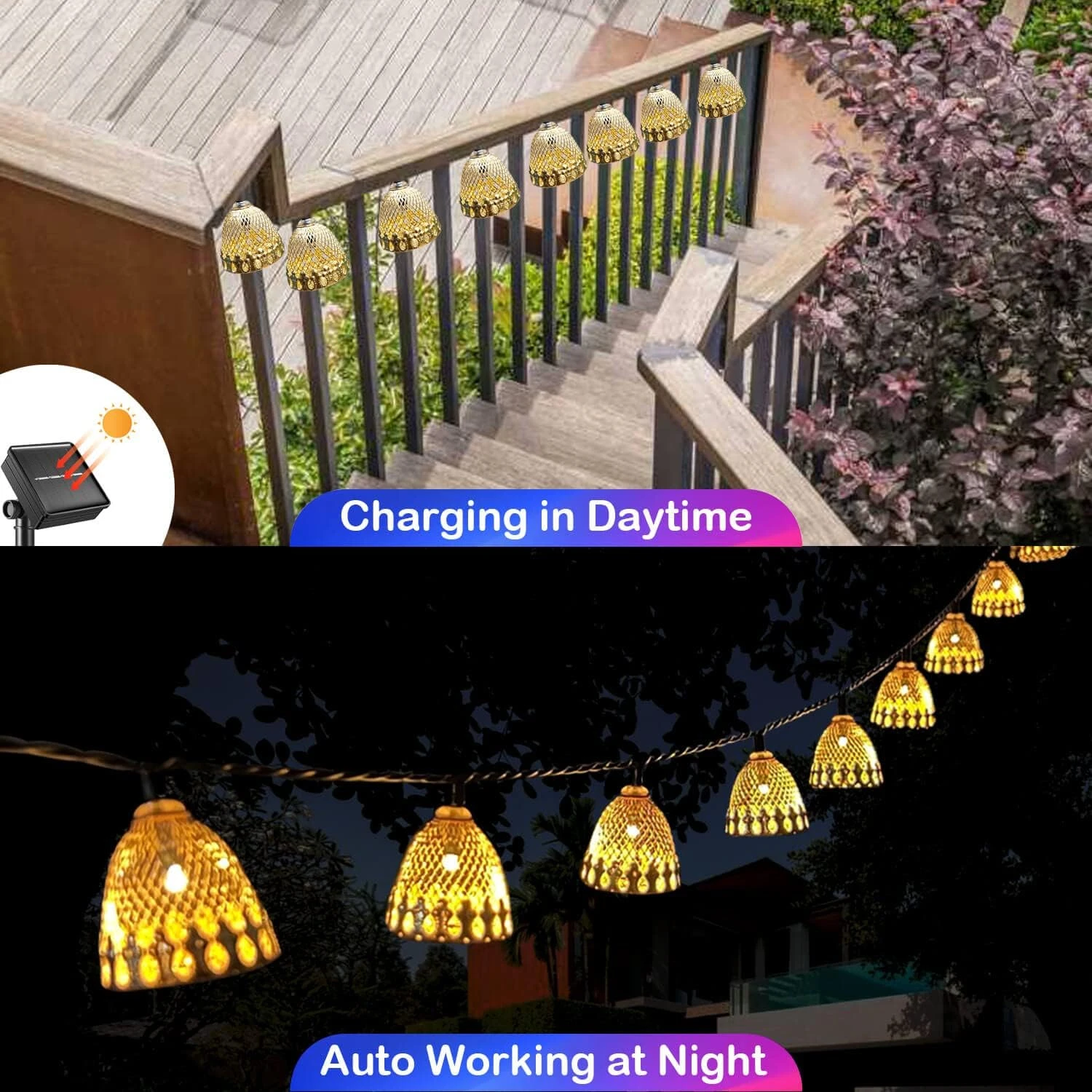 - Modern Elegant Golden Bells: The string lights shaped with 20 pcs golden bell with high brightness LEDs, made of stainless steel material, suit for garden, fence, patio, walkway decorations;