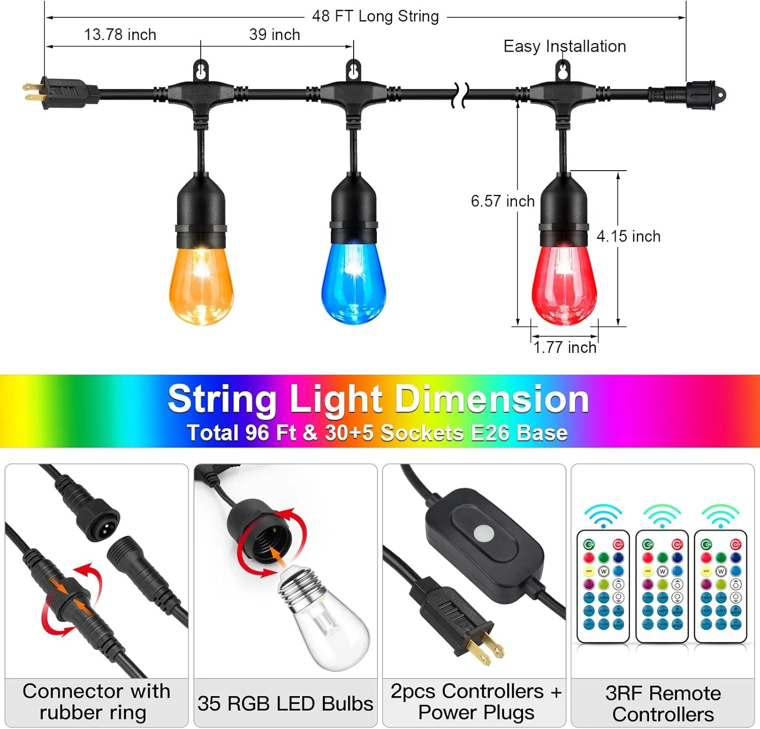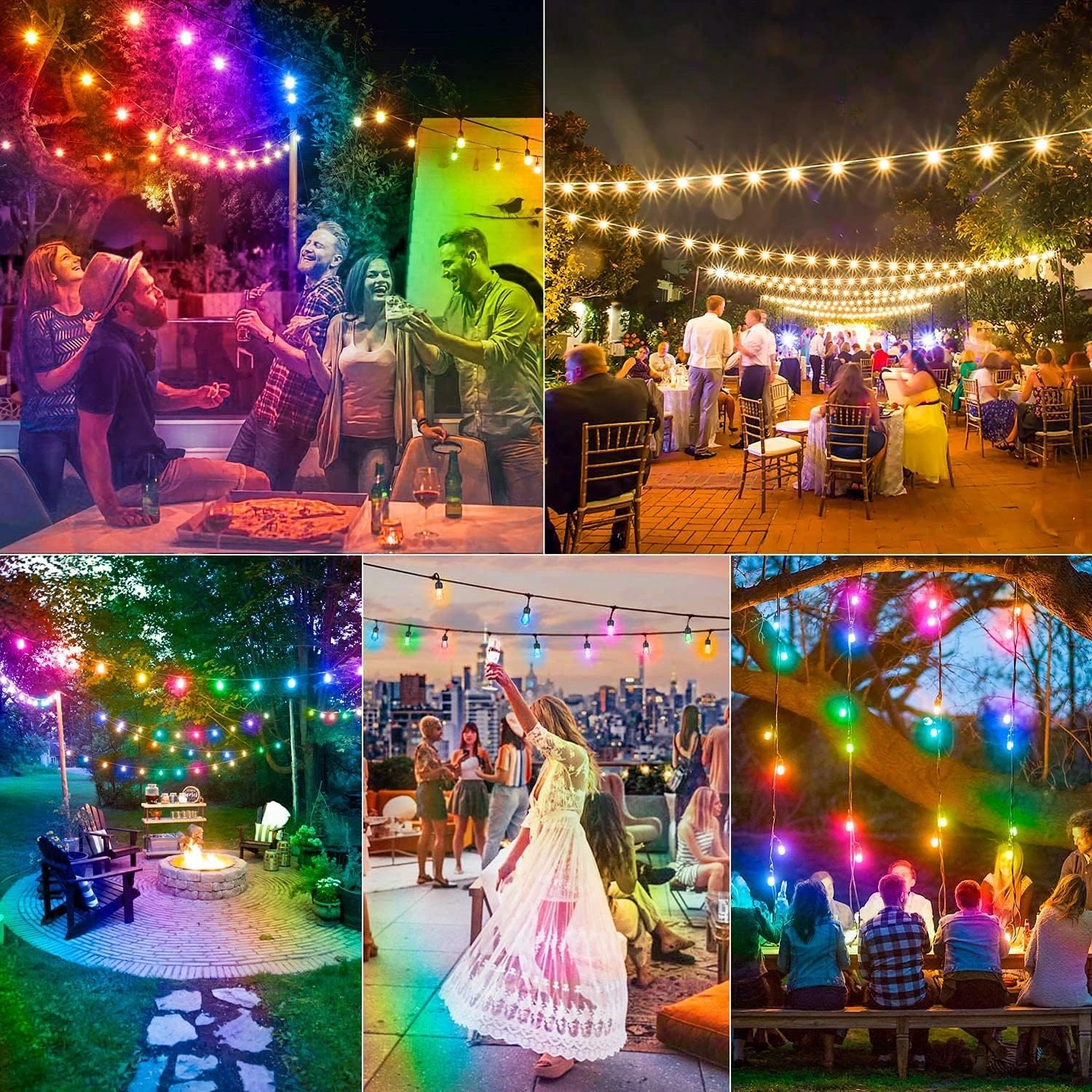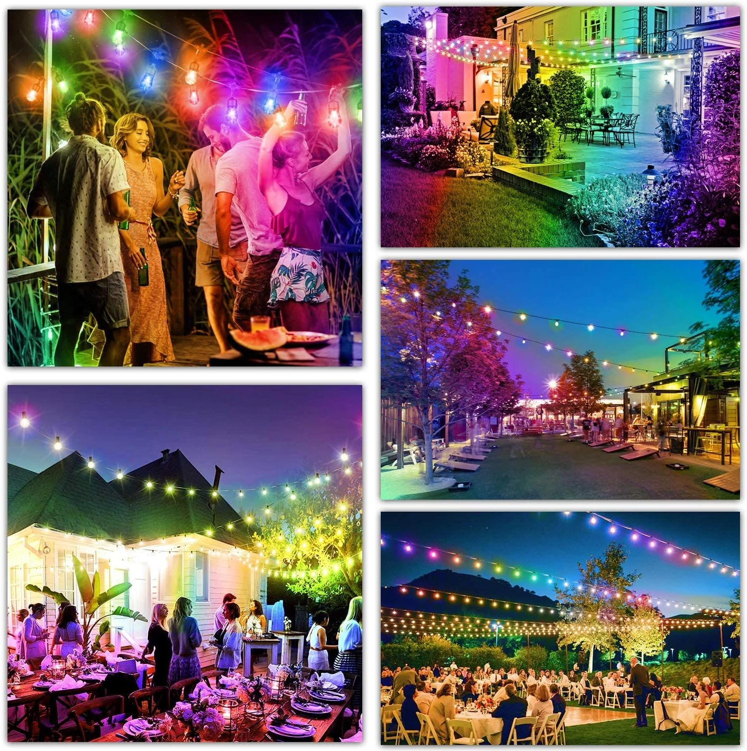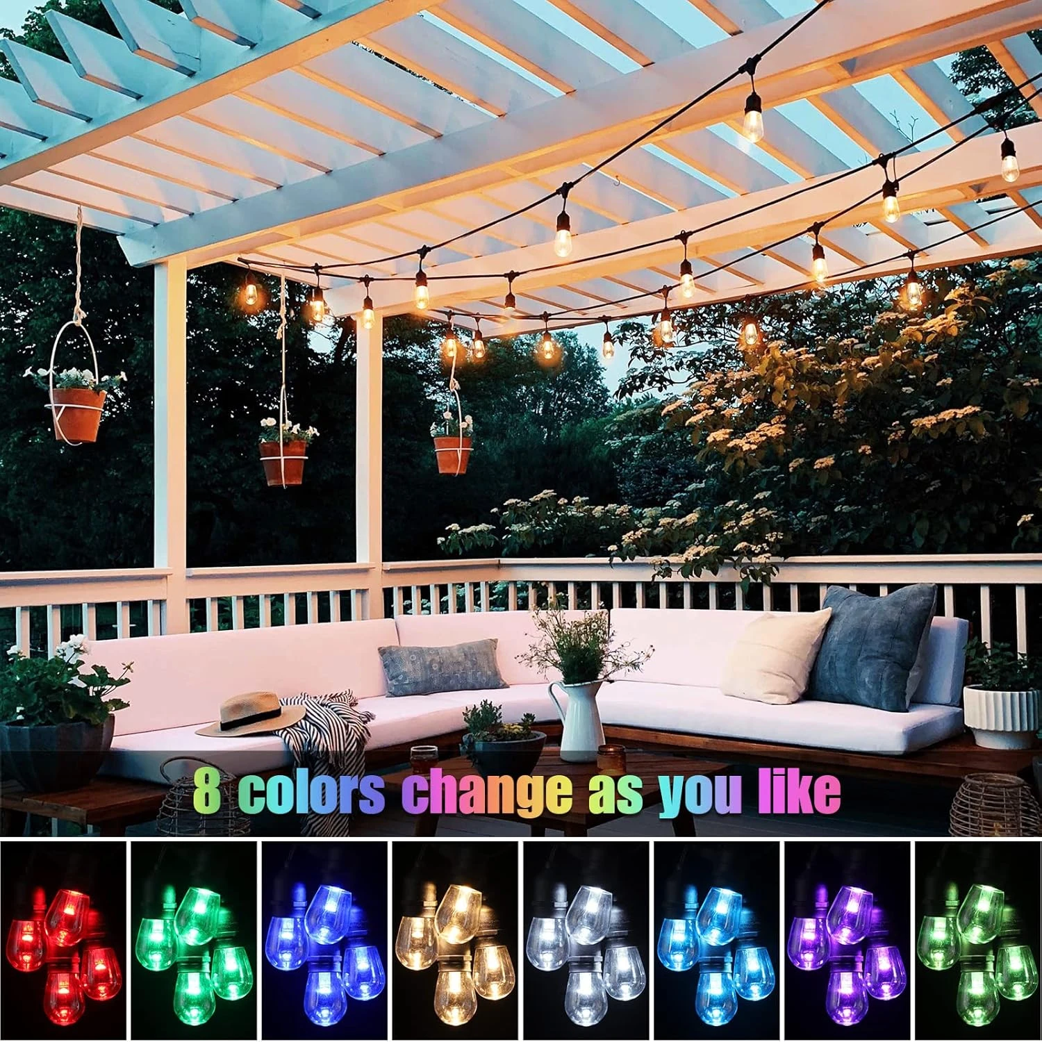 - ❤【8 Single Vivid Colors & Dimmable with Smart Remote Control】One of the easiest ways to add some magic to your outdoor space is to decorate it with RGB outdoor string lights. Lights strung by a pool house, shed, or outdoor dining area can smooth the transition from indoors to out, and provide a subtle directive, pointing to where the fun is happening.