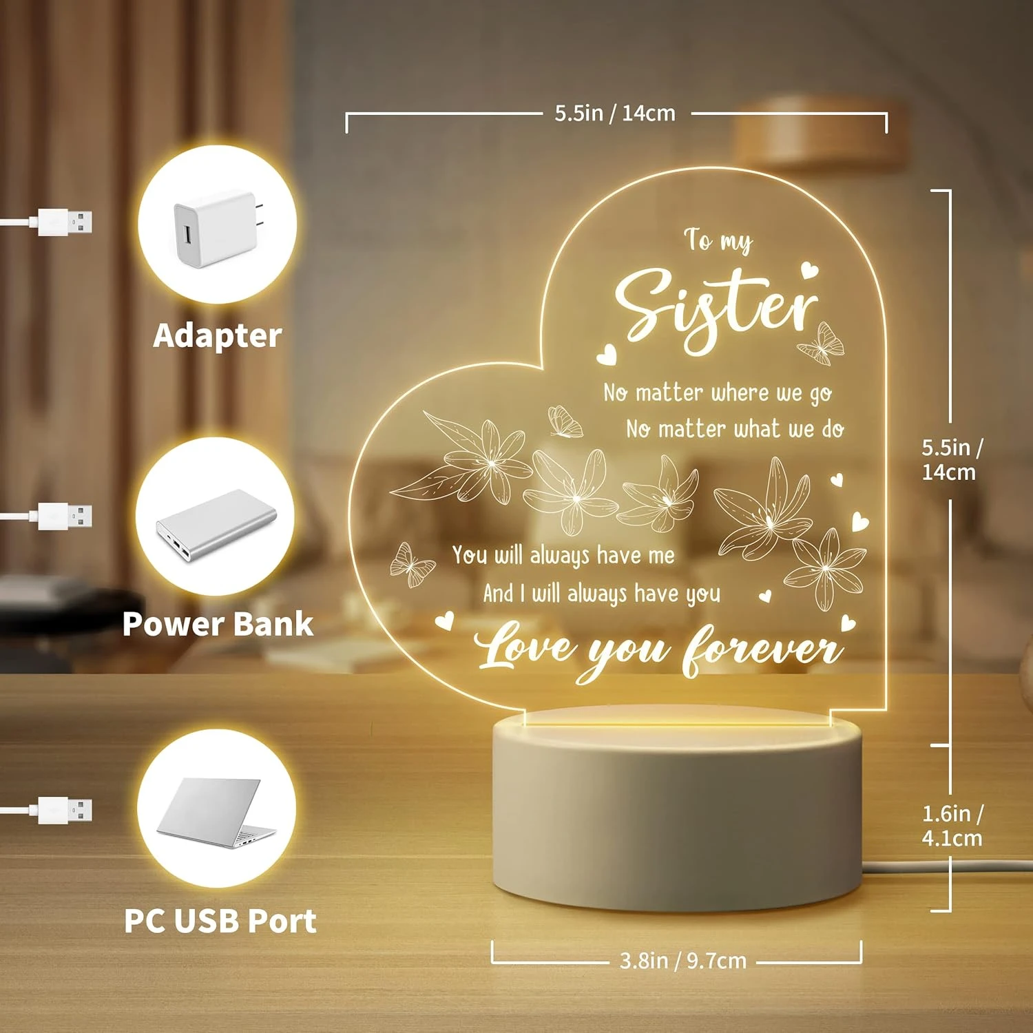 - 【 Best Gifts for Sister 】This acrylic night light for craft engraved with beautiful sayings tell your sister how much you love her. Whether close at hand or far away, sisters are tied together with heartstrings. This night lamp is a novelty present for Birthday, Graduation, Christmas, retirements, housewarming, turning 40th 50th 60th, or 70th years old, or other festivals