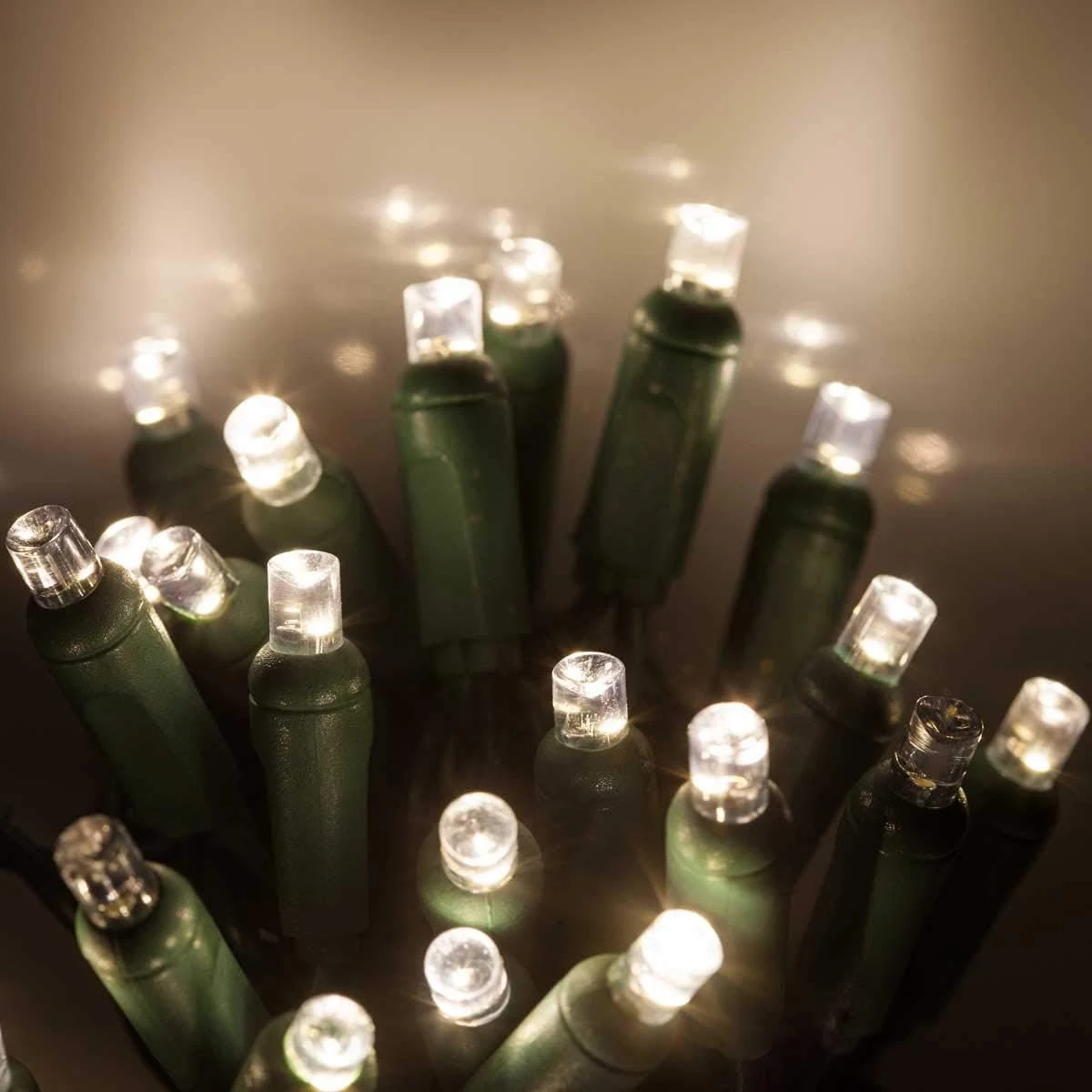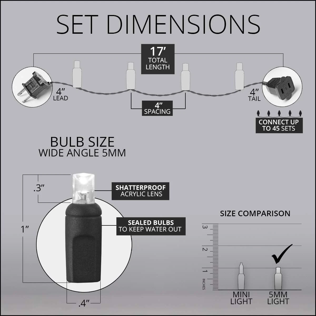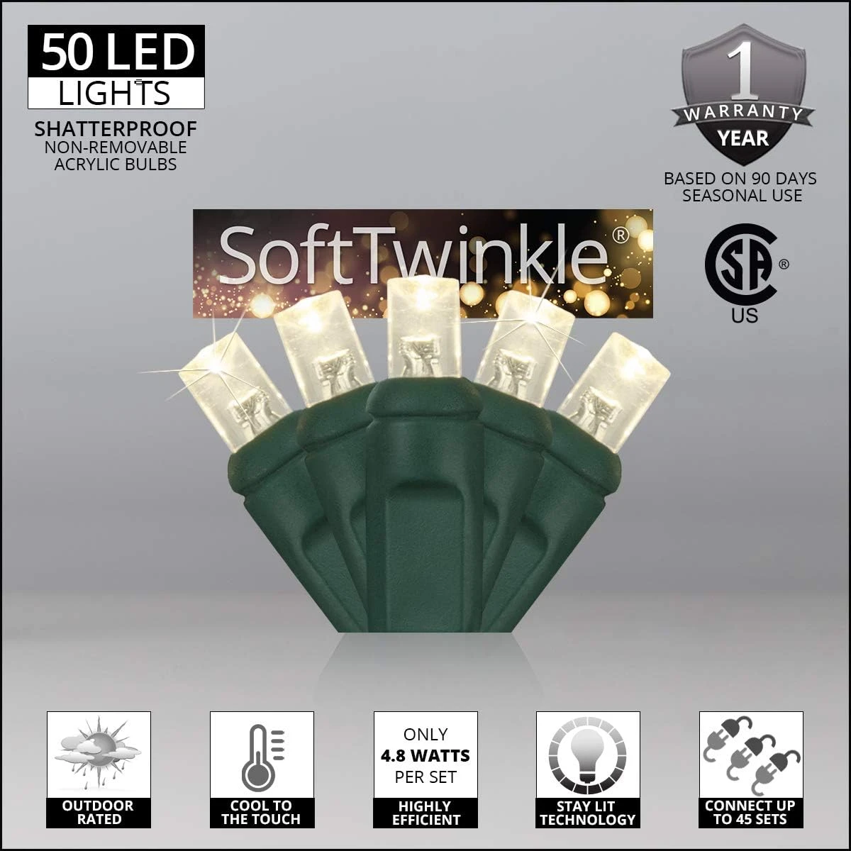 - 50 5mm LED wide angle warm white SoftTwinkle lights spaced 4” apart on green wire, 17’ total length
