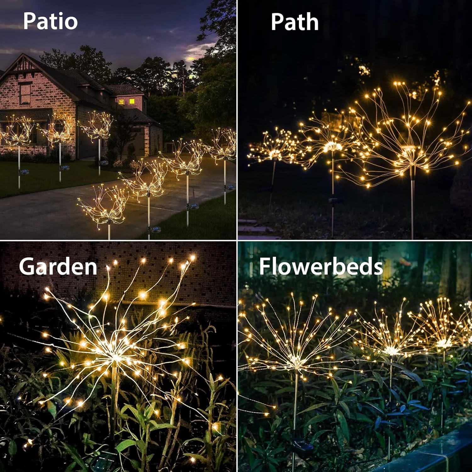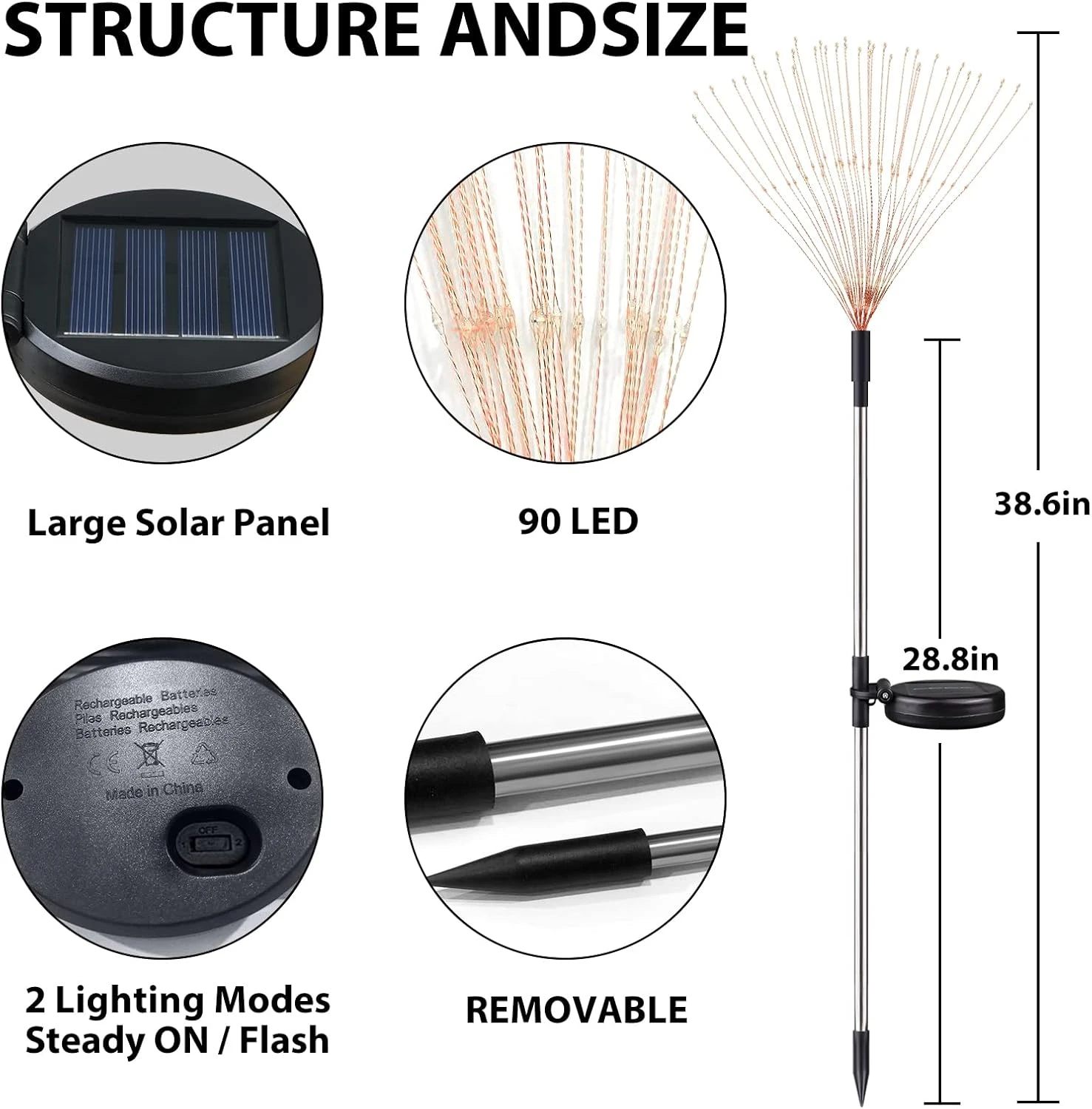 - 【Energy Saving Solar Powered】- Solar cell capacity 600mAh. The firework lights can charge themselves during the day, and they turn on automatically when night falls. It takes six hours to charge and can be lit continuously for 8-10 hours on a full charge.