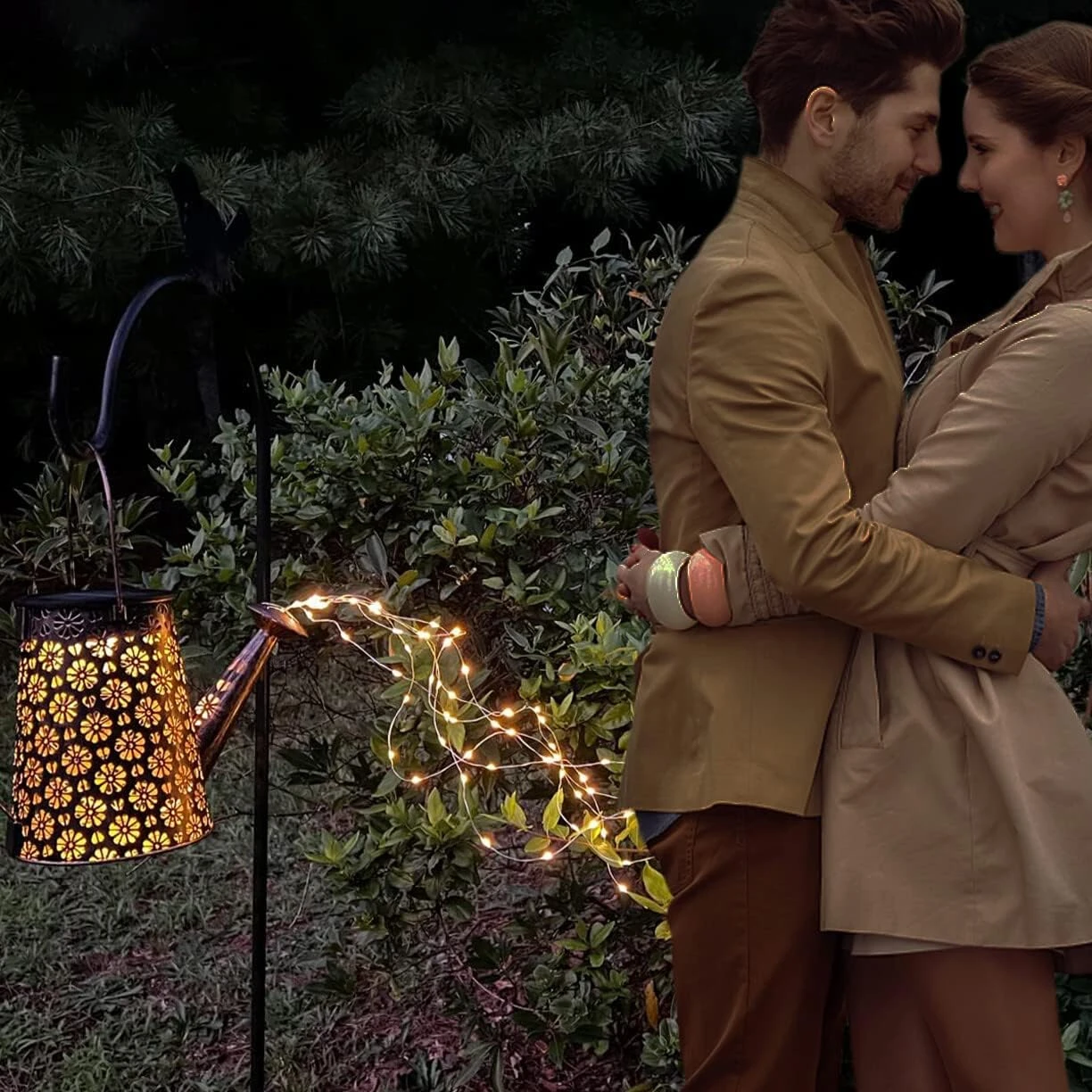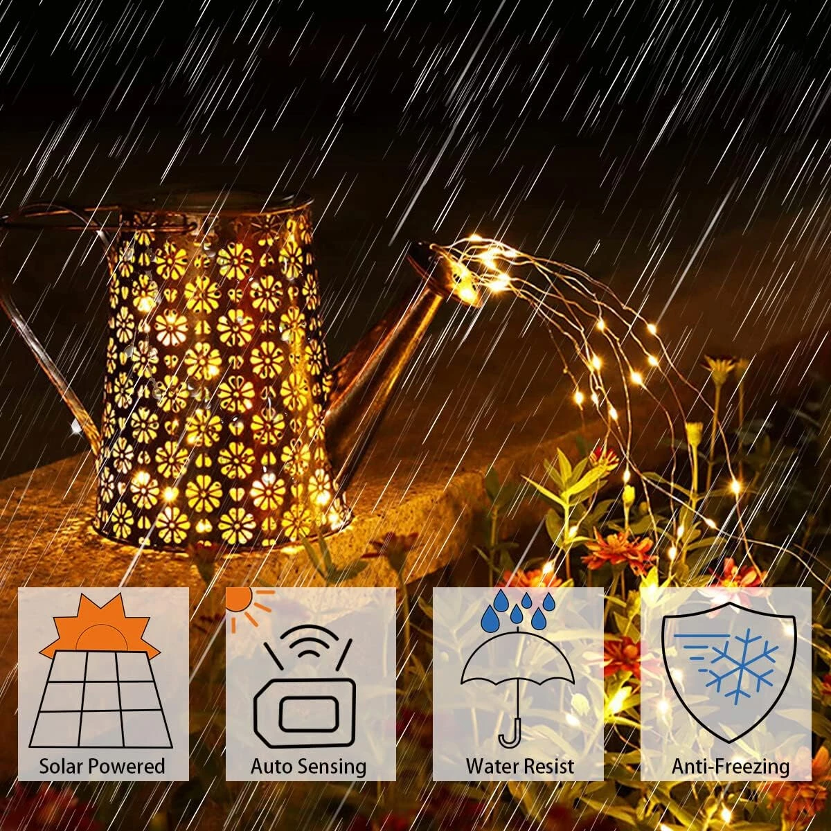 - [ AUTO ON/OFF & ELECTRIC BILL SAVING ] The solar watering can with cascading lights is solar powered. When the sunlight goes below the visible region of our eyes, the sensor will turn on the light automatically. On the contrary, the light will be turned off automatically in the daytime. No electric costs involved!