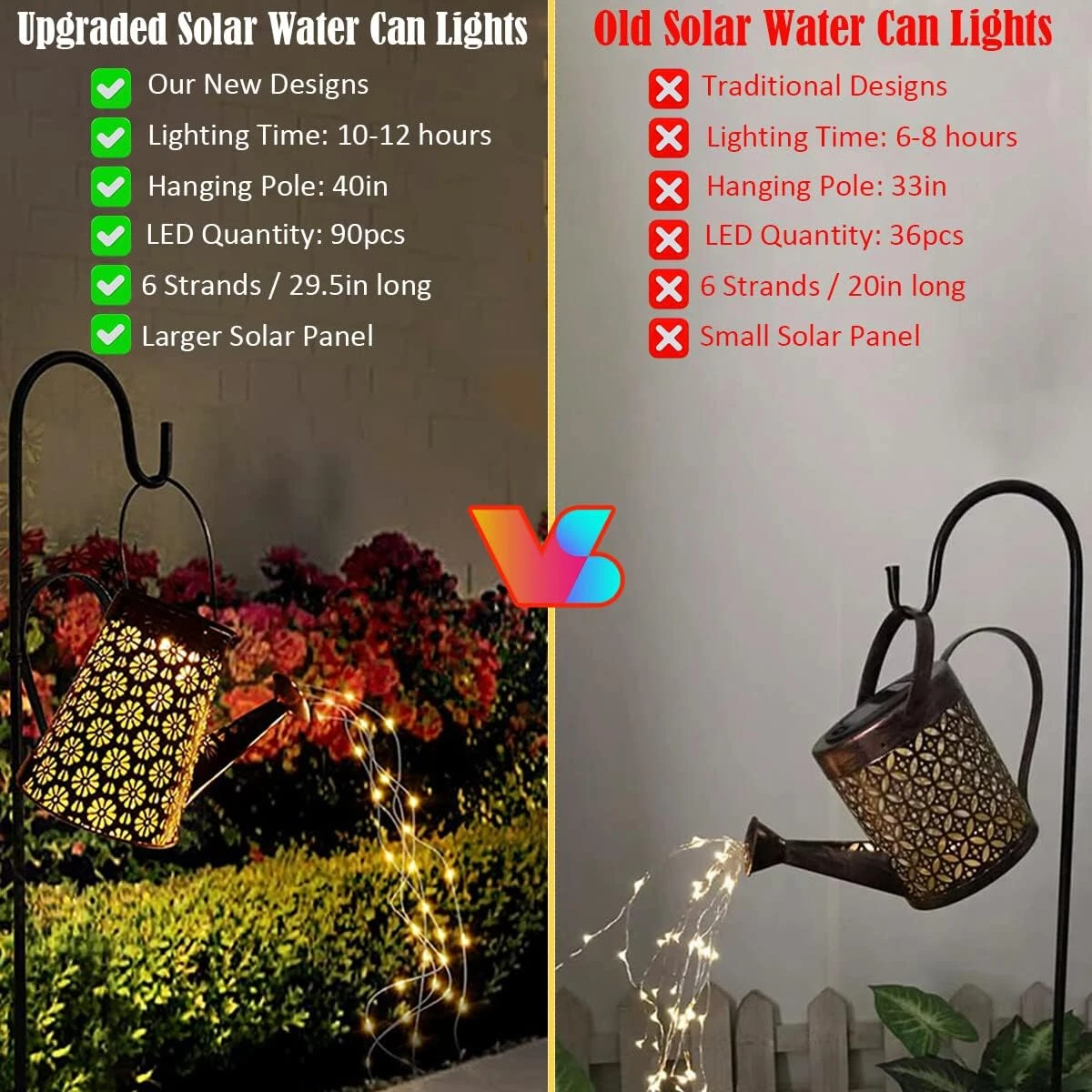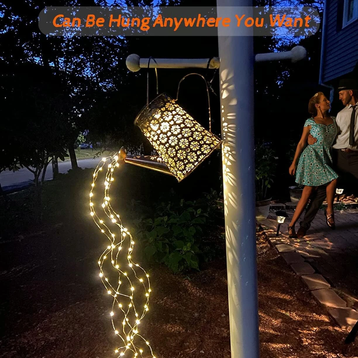 - [ BEAUTIFUL OUTDOOR DECOR ] The solar watering can with cascading lights is composed of 6 Copper string lights 25.9in(75cm) long string with 90 super bright LEDs. It’s so pretty and bright that makes your yard sparkle all night long.