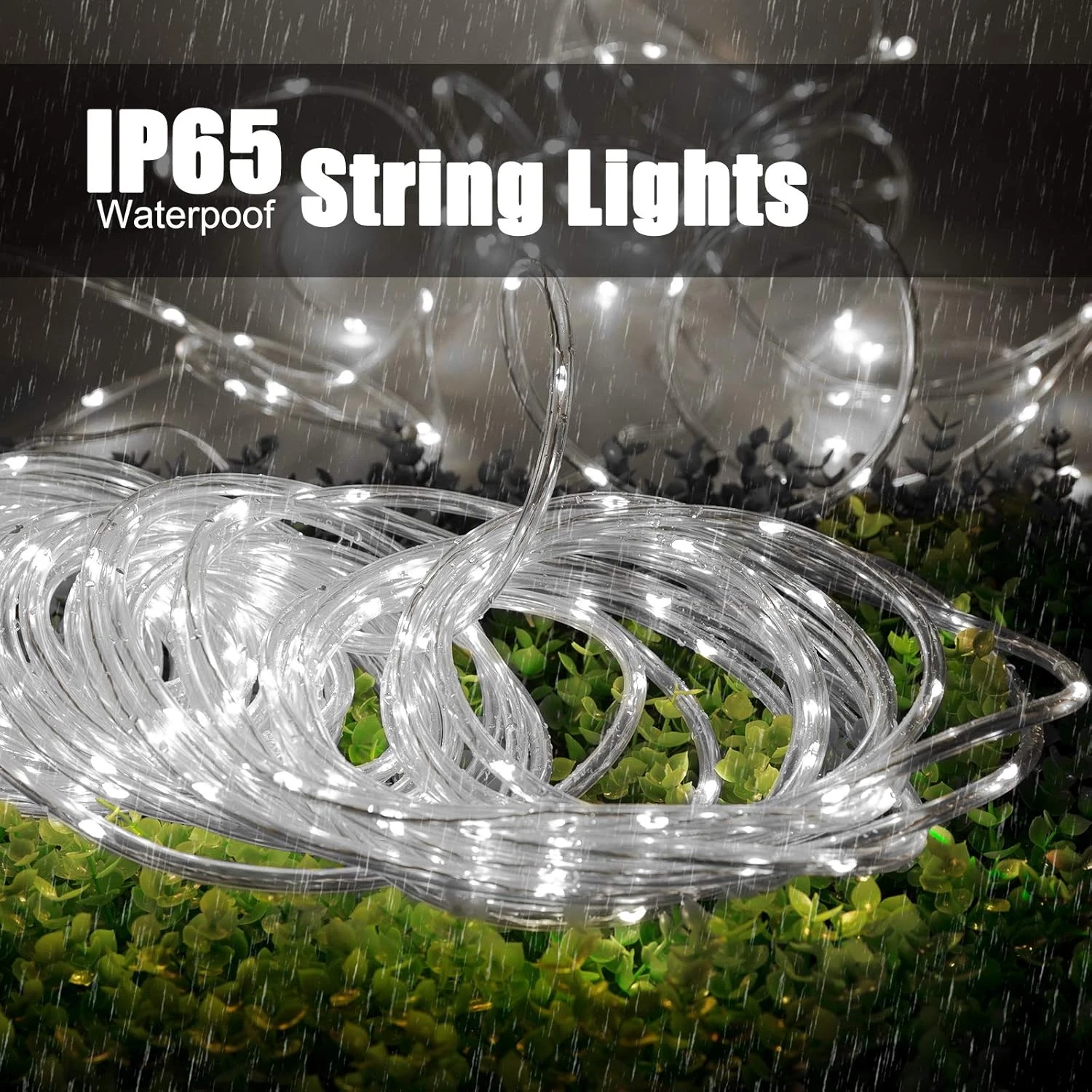 - High efficiency solar powered rope lights:The factory equipped sophisticated and 120 degree adjustable monocrystalline silicon solar panel plus the inbuilt 1200mAh rechargeable battery. It can work up to 10 hours after 4 to 6 hours of charging by sunlight