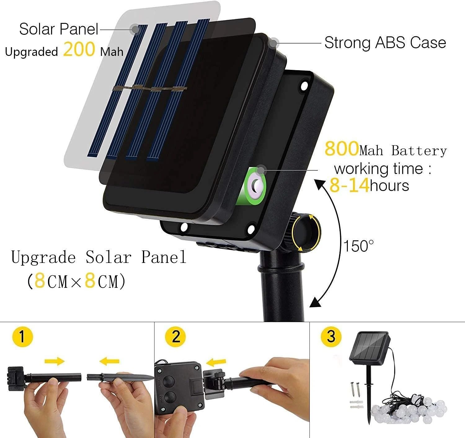 - 【50 Super-Brilliant LED Lights】: Adopt larger solar Panel(8CM×8CM) and solar rechargeable battery, with higher energy conversion rate to deliver excellent lighting performance. Work continuously for 10-14 hours once fully charged, the battery is replaceable for long lifespan use. 50 Super-Brilliant LED Lights with 24ft length cable, enough length to fit any indoor and outdoor space. Ideal decoration for your gardens, porch, lawn, patio, gate, yard, wedding, party etc.