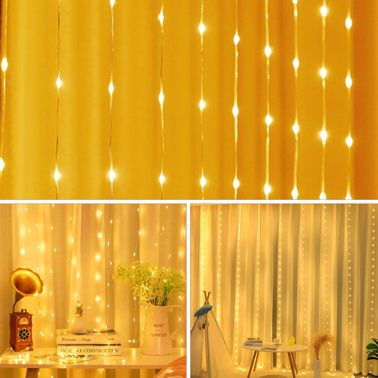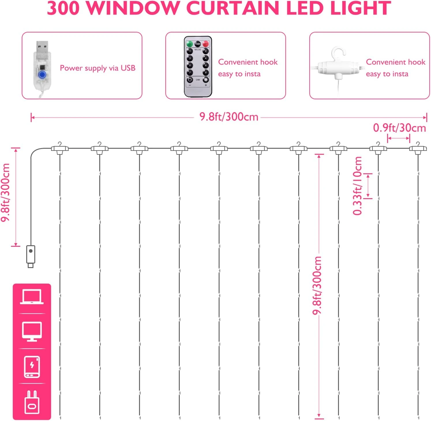 - Specification: suitable for the curtain or wall of 3 m long and 3 m wide. The cable with USB port is 3 meters. 300 LEDs spread over 10 strands, each strand has 30 LED light sources and is arranged at a distance of about 30 cm apart.