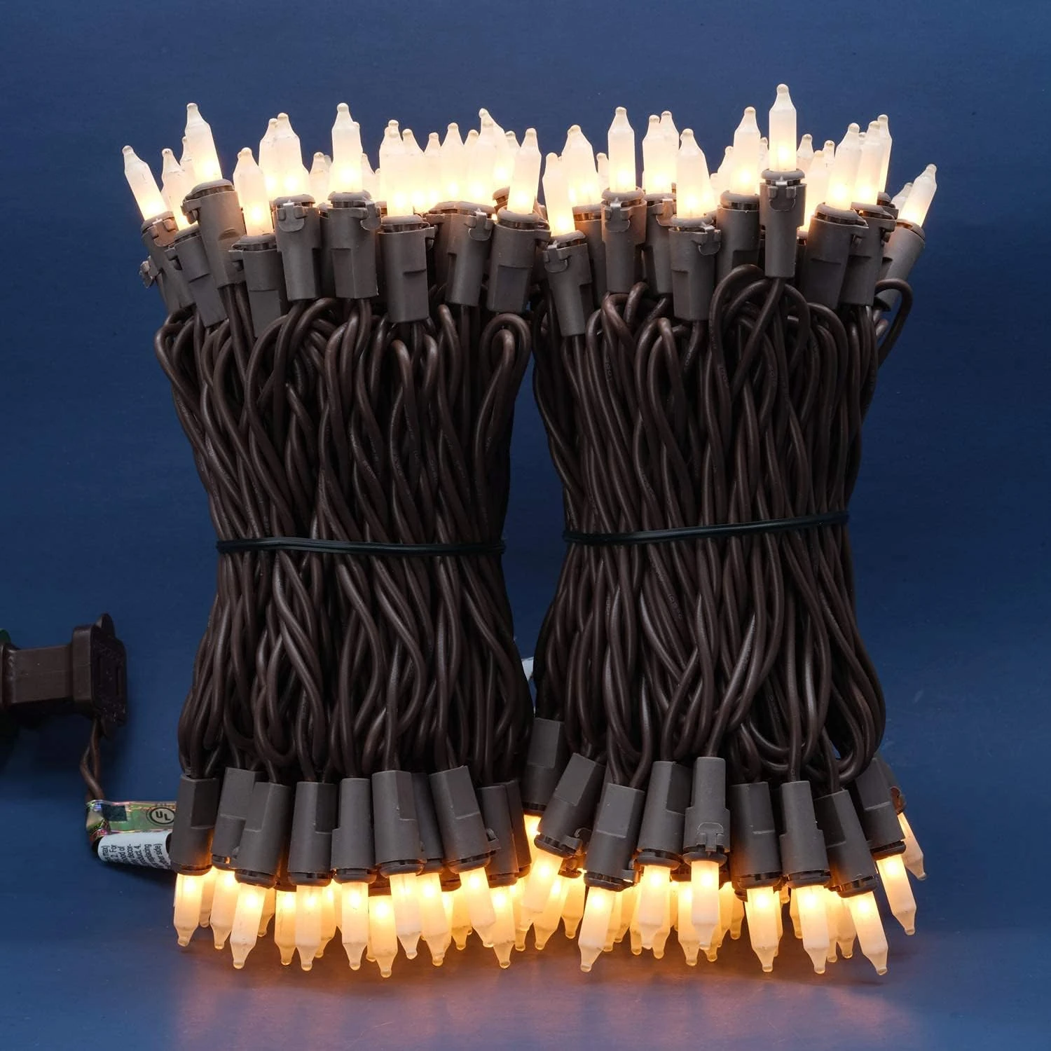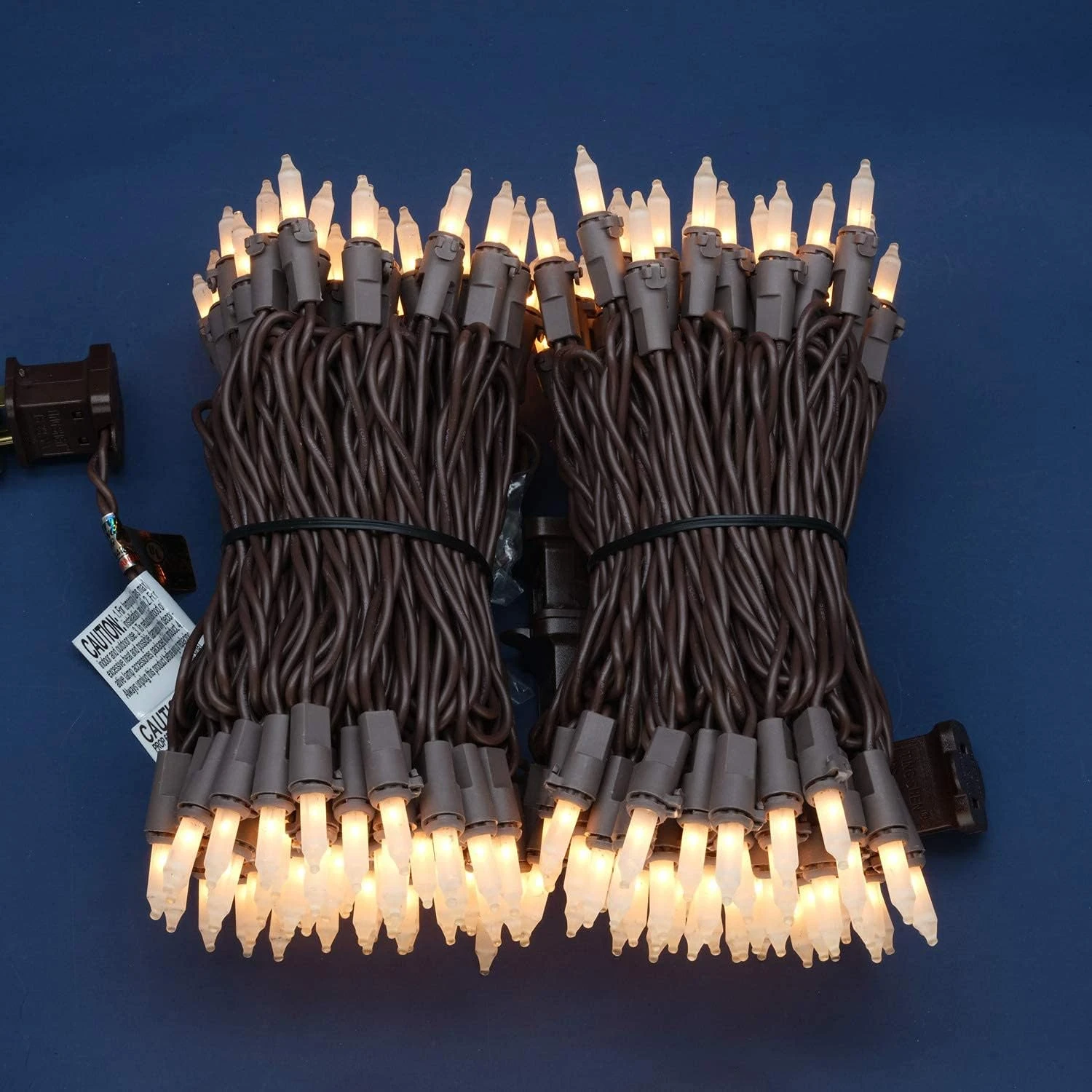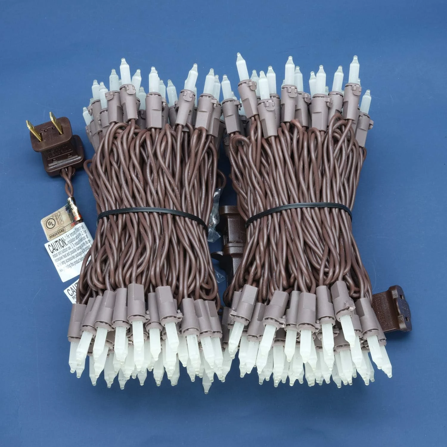 - # SPECIFICATIONS # Each package contains 2 strands of brown wire string lights, 33 feet per strand with 100 white frost lights. Total length 66 feet with 200 lights. 5 inch lead, 4 inch spacing, 5 inch tail. The green wire blends well with greenery to create a natural lighting effect. Incandescent Christmas Lights offer superior quality at affordable prices making them the ideal choice for a variety of lighting projects.