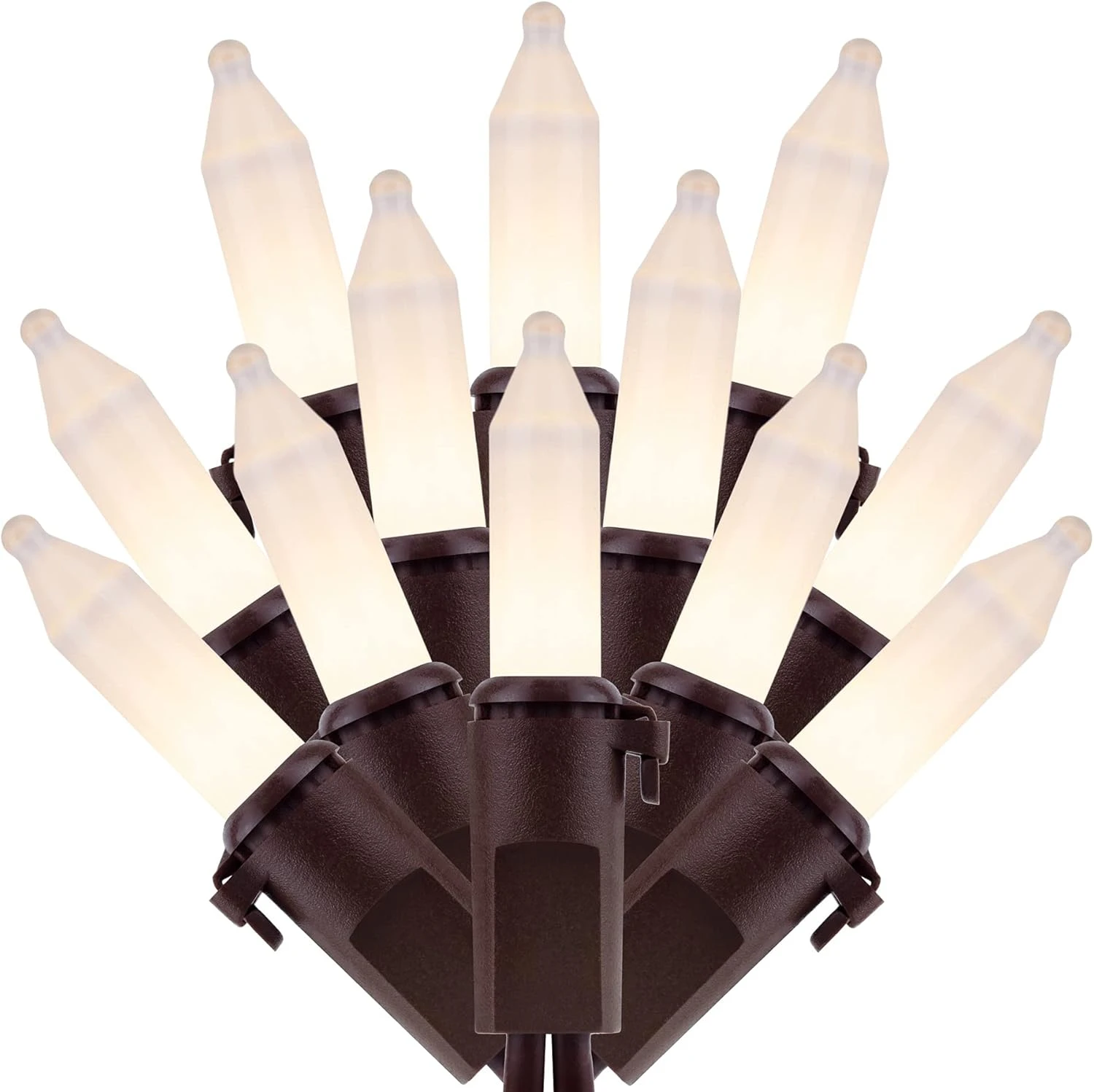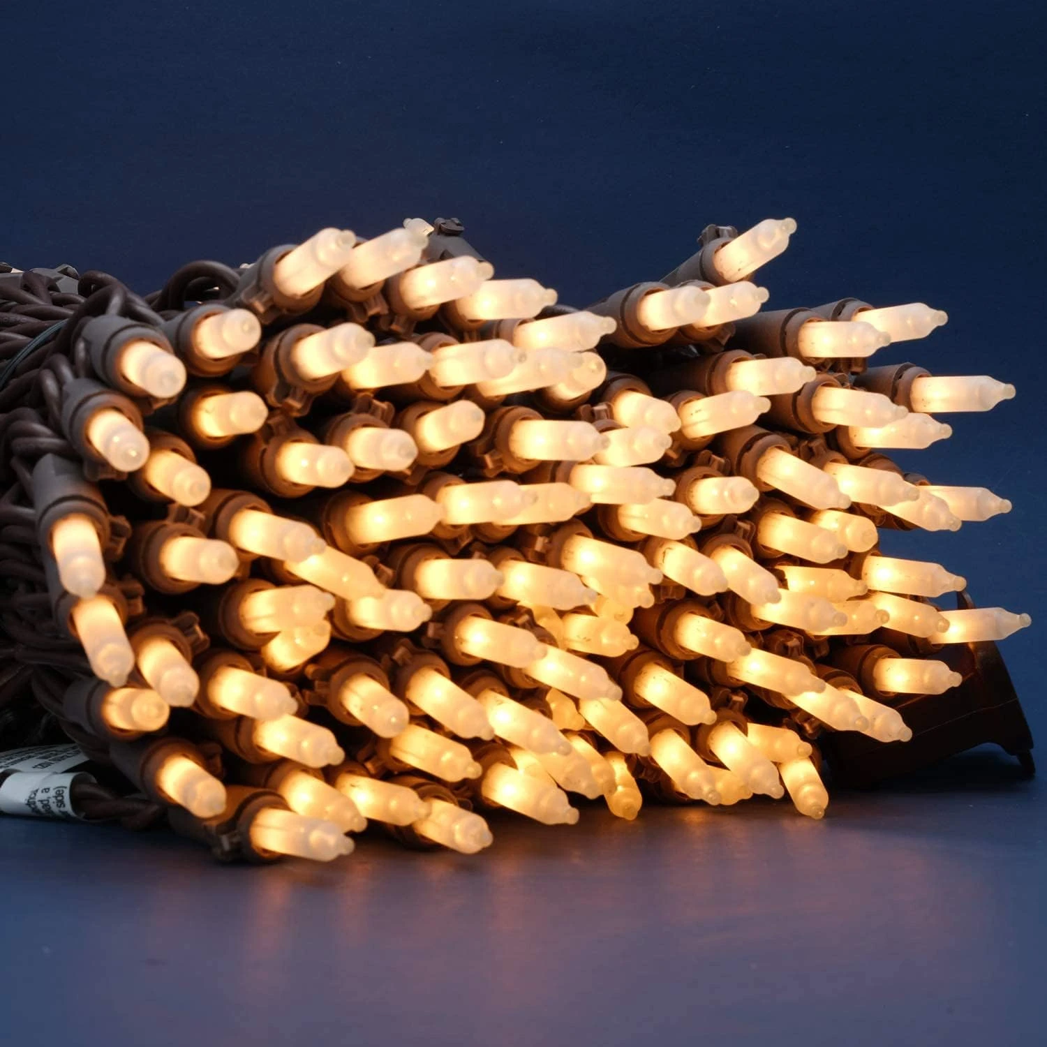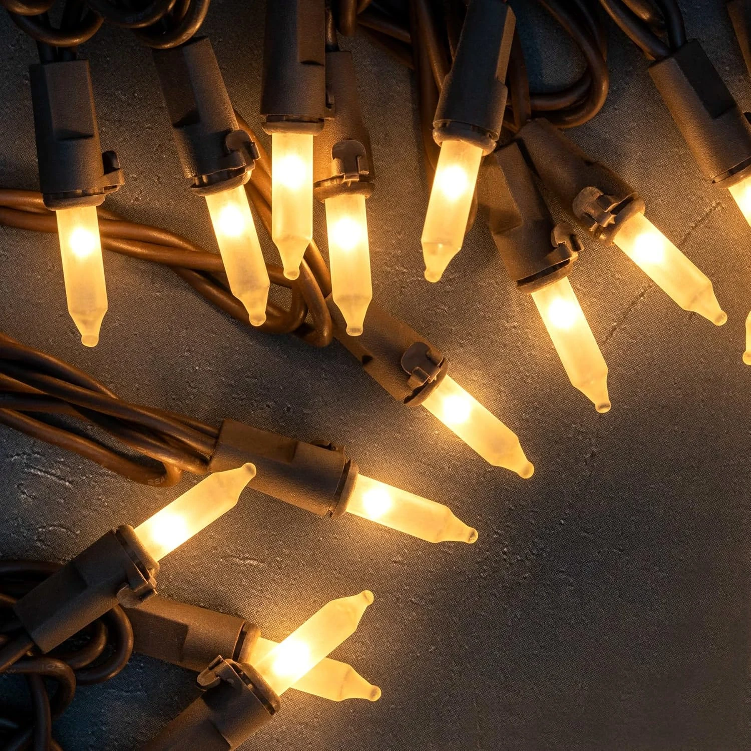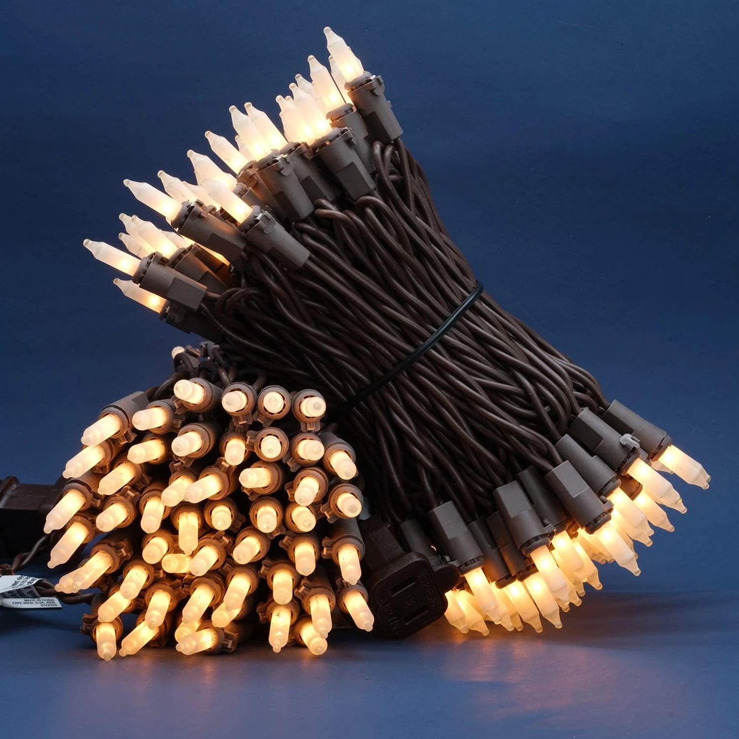 - # SPECIFICATIONS # Each package contains 2 strands of brown wire string lights, 33 feet per strand with 100 white frost lights. Total length 66 feet with 200 lights. 5 inch lead, 4 inch spacing, 5 inch tail. The green wire blends well with greenery to create a natural lighting effect. Incandescent Christmas Lights offer superior quality at affordable prices making them the ideal choice for a variety of lighting projects.