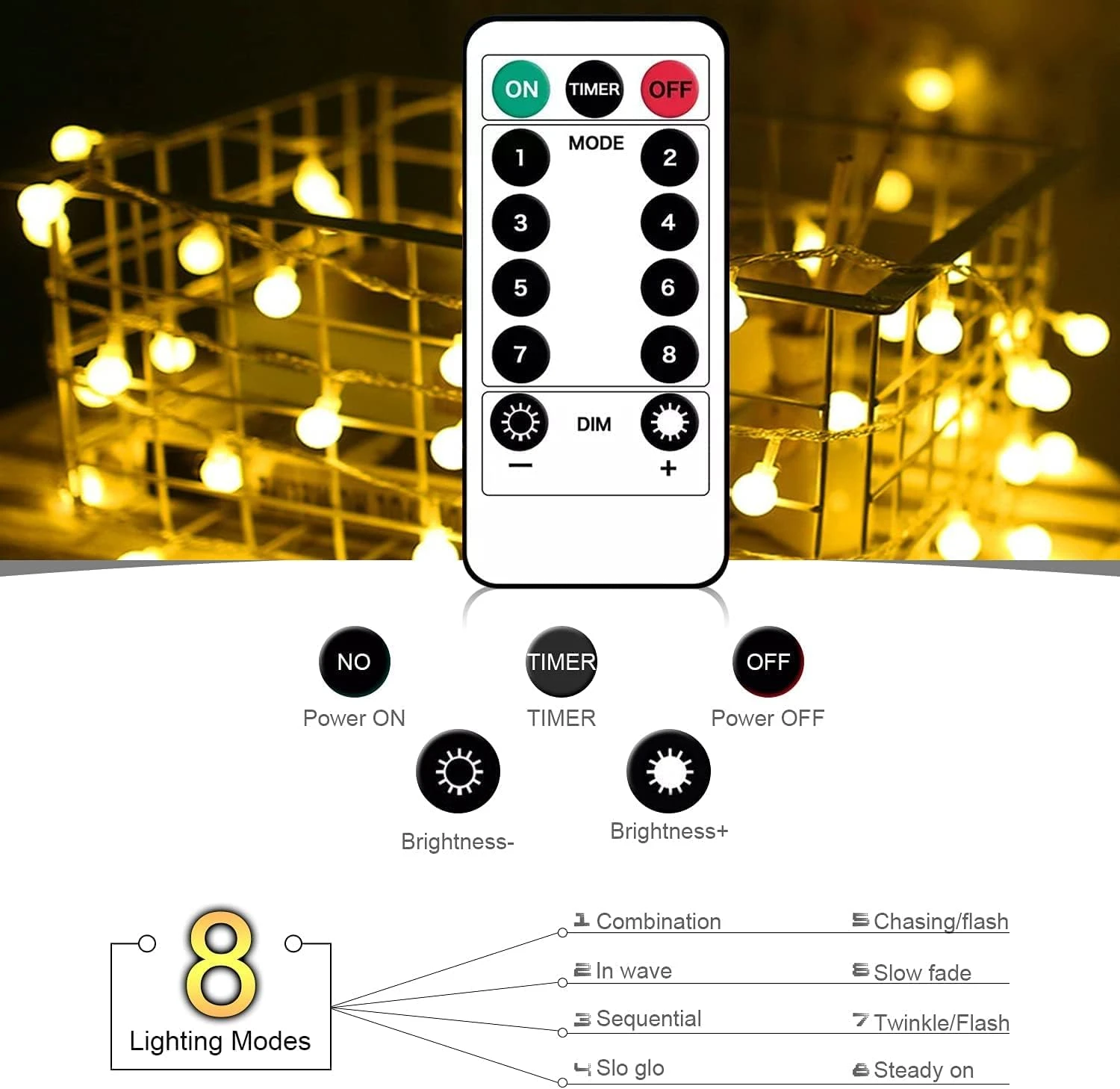 - 8 lighting modes, timer functions and dimmer: The christmas lights have 8 lighting modes, namely combination, in waves, sequential, slo-glo, chasing or flash, slow fade, twinkle and flash, steady on. The lights also have a memory function allowing you to set your specific mode and use the timer function on the remote to turn on the lights for 6 hours and off for 18 hours automatically every day. Set the brightness by dimmer to adapt to special occasions like dating, wedding.