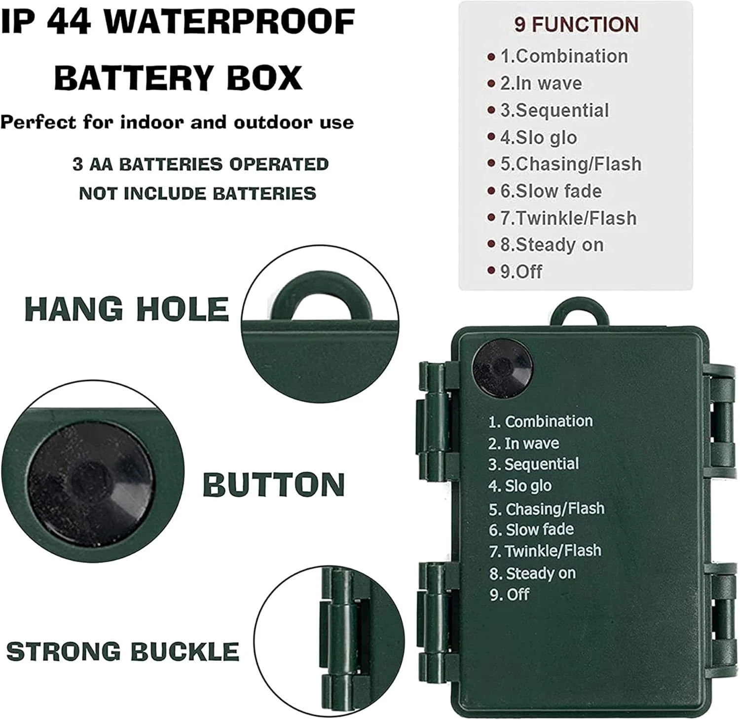 - Waterproof & Easy to Use: Both the Christmas string lights and battery box are IP44 waterproof level. Suitable for outdoor and indoor use withstand rain and snow. No plug in, the soft wire allow you to wrap the lights in everywhere you want, such as tree, wall, porch, patio, balcony and so on.