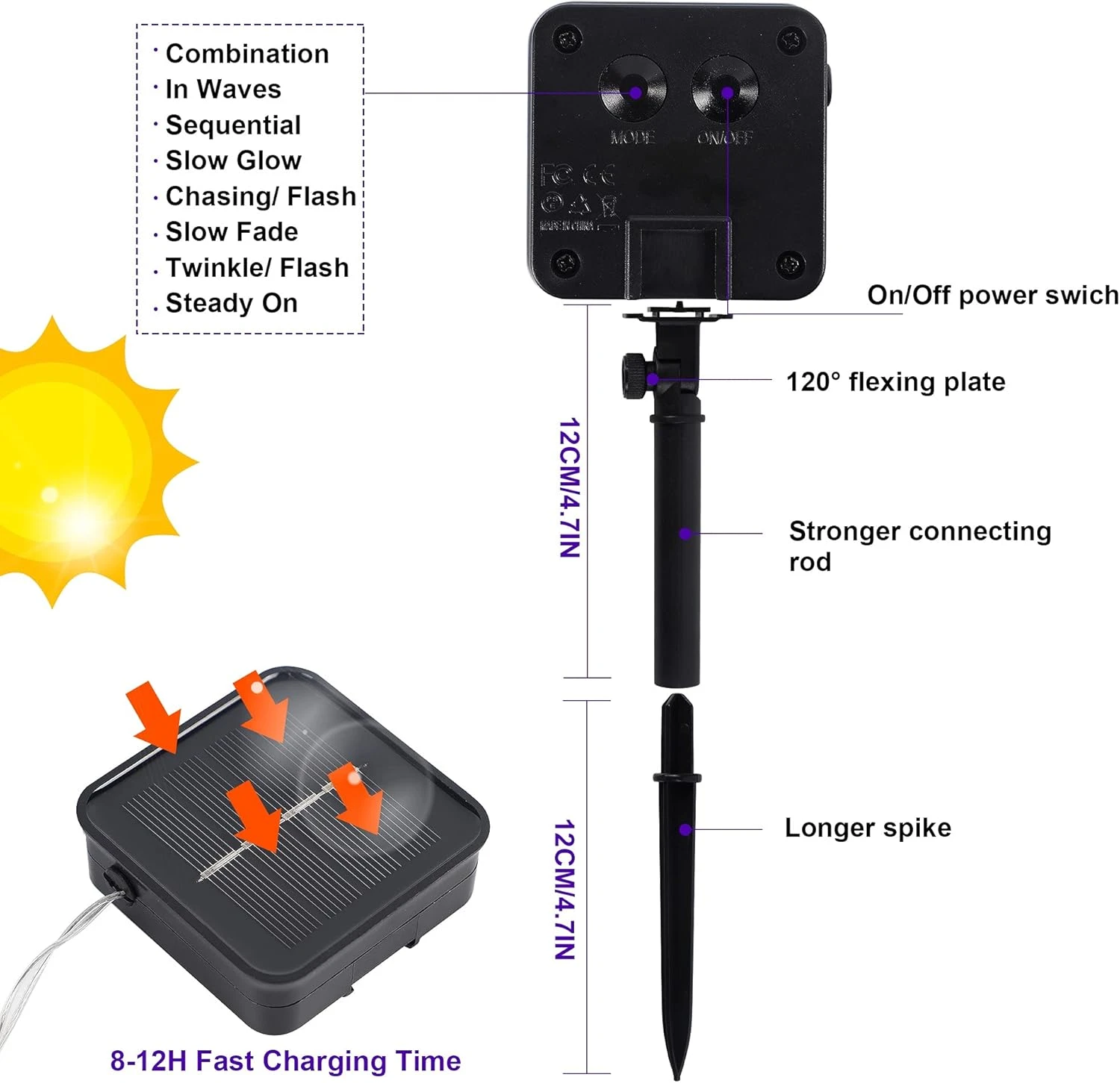 - 8 Lighting Modes with Memory Function: Our solar string lights have 8 lighting modes for you to choose: combination, in waves, sequential, slo glo, chasing/flash, slow fade, twinkle/flash, and steady on. Comes with memory function, remember last setting automatically after turn off the power, no need to reset again.