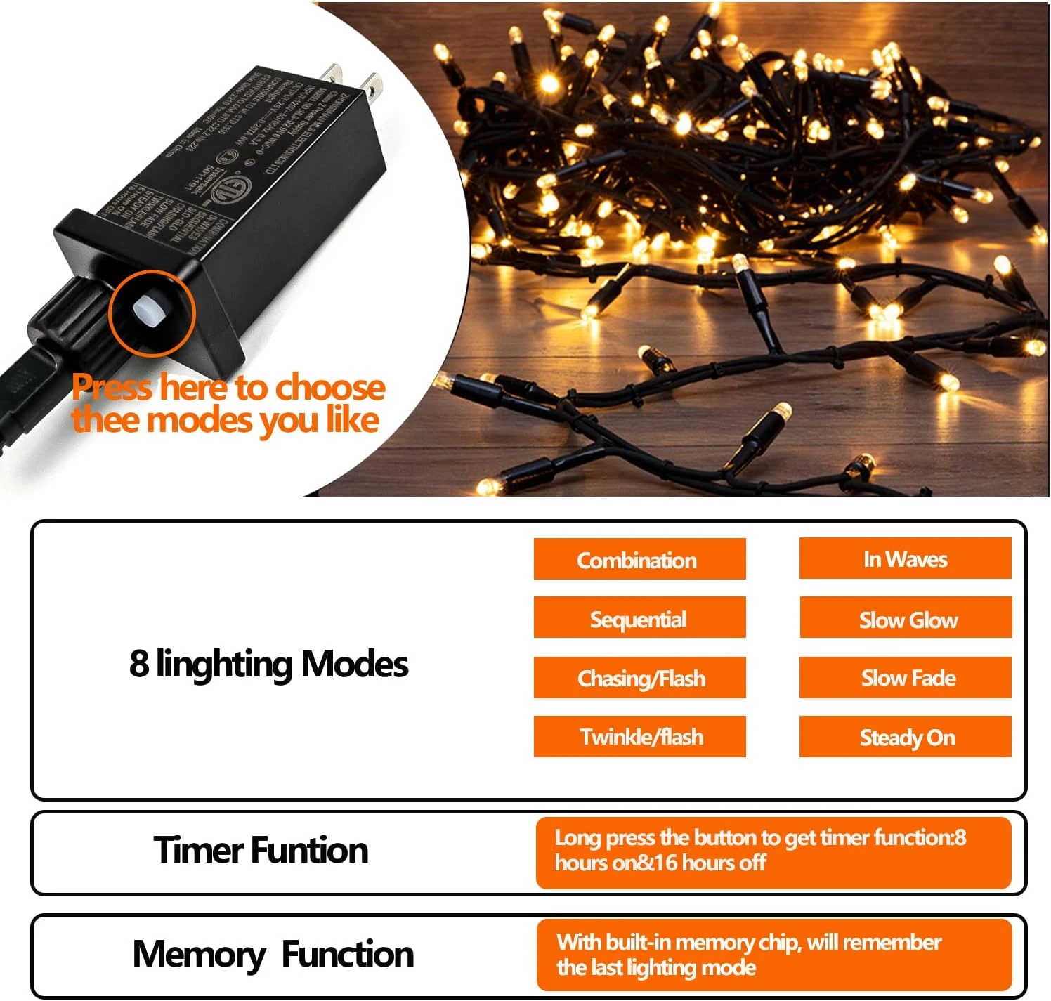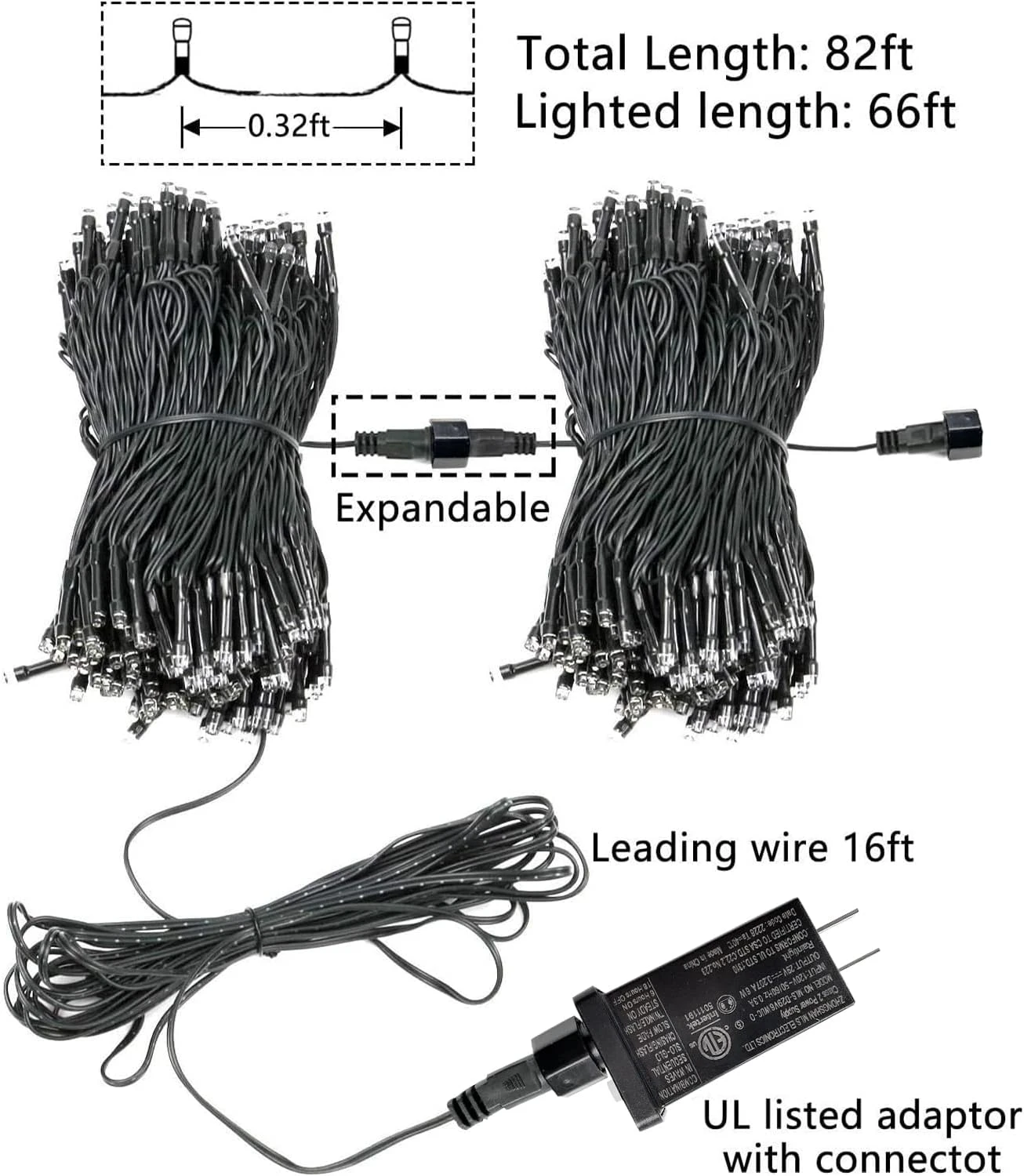 - 【Timer & Memory Function & 8 Modes】: Super bright with new upgraded LED bulbs. This Extendable 200 LED warm white green wire plug in string lights have 8 lighting modes to satisfy your diverse decorative effect. Total length is 82ft, of which 66ft with lights.