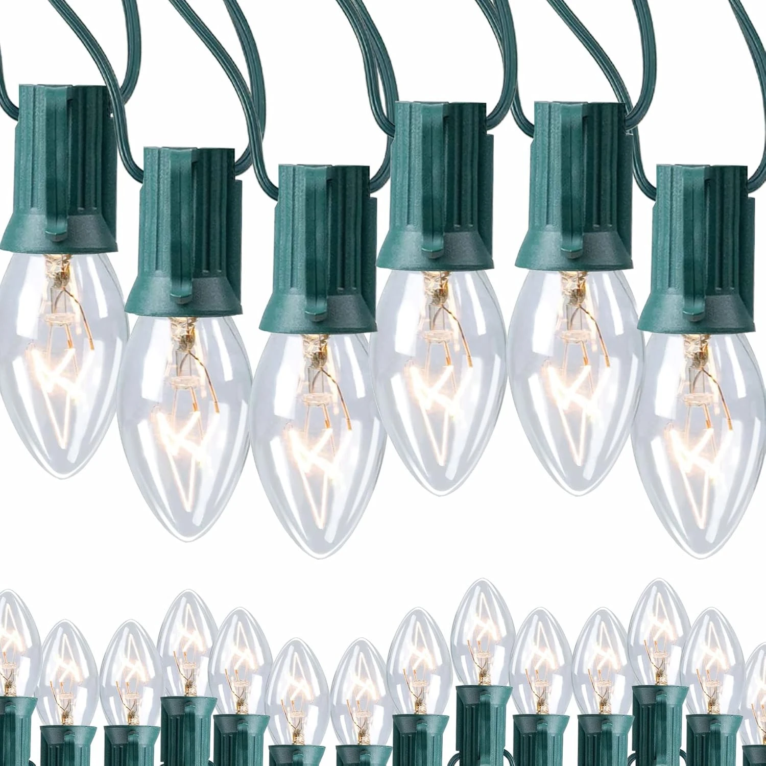 - C9 CLEAR CHRISTMAS LIGHTS : Vintage 50ft Clear Christmas string lights on green wire has 50 count C9 bulbs, 6” lead with male plug,6” tail with female connector, each bulb space 12”. Lighted Length 49 Feet, total Length 50 Feet. Old Fashioned c9 lights restore the natural and original warm white color and decorate your house indoor and outdoor.