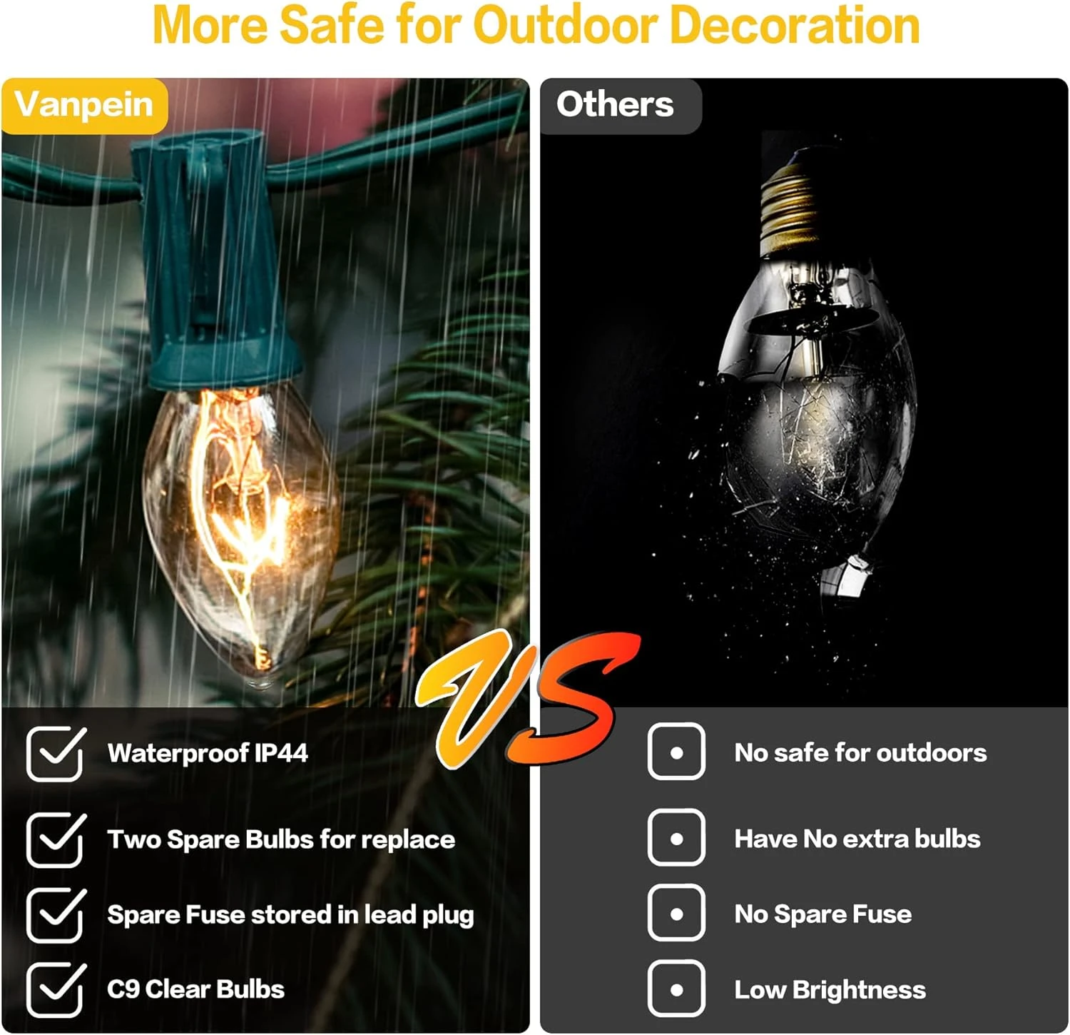 - SAFE & WATERPROOF : UL Certified outdoor Christmas lights come with 120V 7W incandescent C9 bulbs, C9/E17 candelabra socket base, US standard plug with built in 8 amp fuse for safety outside decoration. IP44 waterproof lights set can withstand rain or snow while outdoor. Each bulb is independent, the rest stay lit if one burns out. Especially, these classic c9 string lights set includes Four EXTRA BULBS for replace.