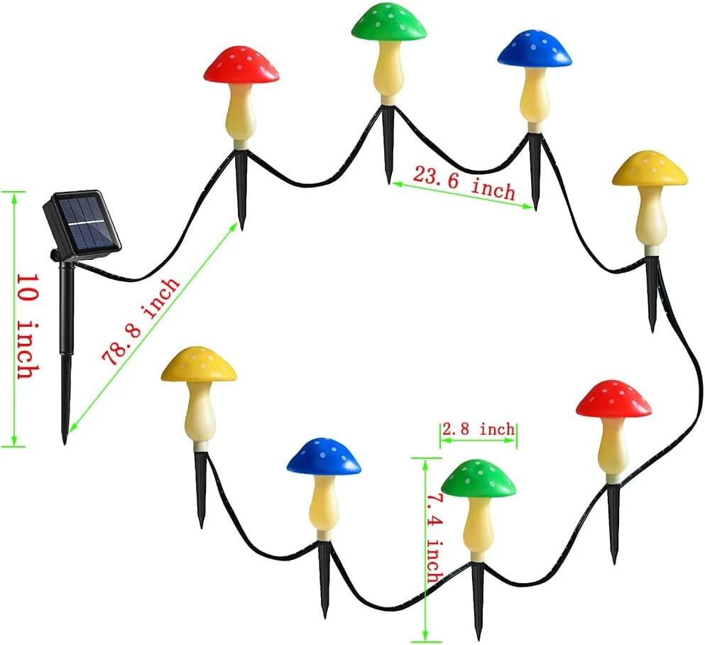 - Solar garden decor lights with 8 cute mushroom led lights, mushroom icon diameter:2.9 inch, length between 2 mushroom: 23.6 inch, leading circuit: 6.6 ft, total length:20.3 ft.