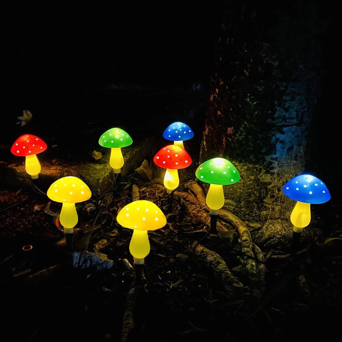 - Solar powered mushroom decor stake lights. 8 light modes: combination, fireflies flashing, waves, fading, chasing/flashing, fading slowly, twinkle/flashing and steady on.