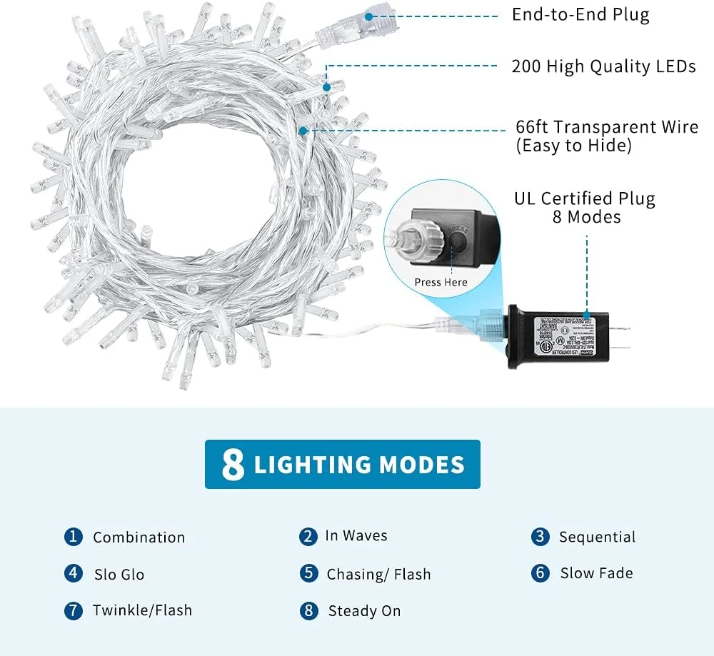 - [8 Lighting Modes]: Simply by pressing the button on the controller, you can change up to 8 lighting modes, including Combination, In Waves, Sequential, Slo-Glo, Chasing/Flash, Slow Fade, Twinkle/Flash, and Steady on.