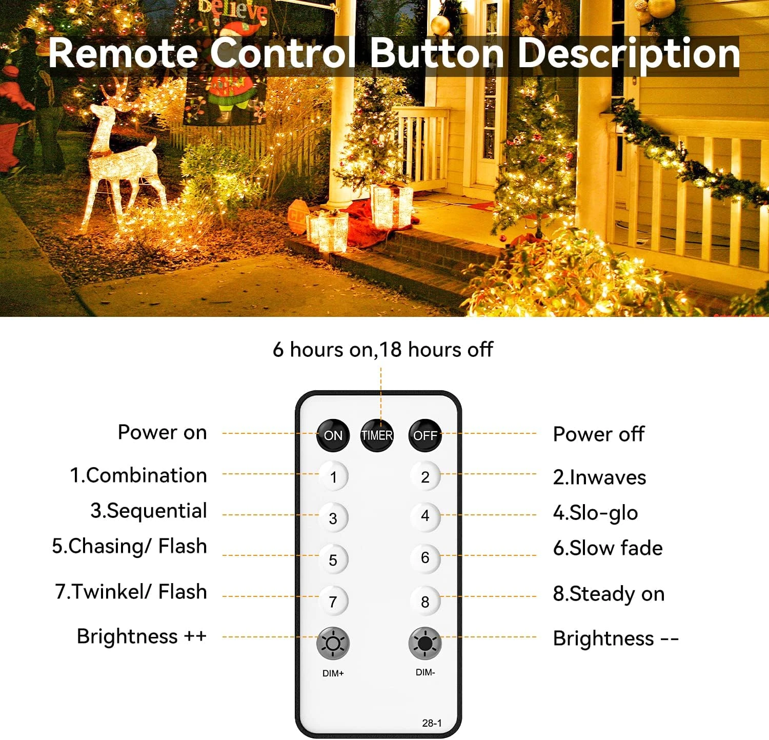 - 🎄【8 Lighting Modes & Dimming Function】 8 modes for you to choose: combination, wave, sequence, slogs, chase/flash, slow fade, flicker/flash and always on. You can also adjust the brightness of the lights to create a more spooky holiday atmosphere. You can select your preferred flash mode by using the remote control or by pressing the mode button on the plug.