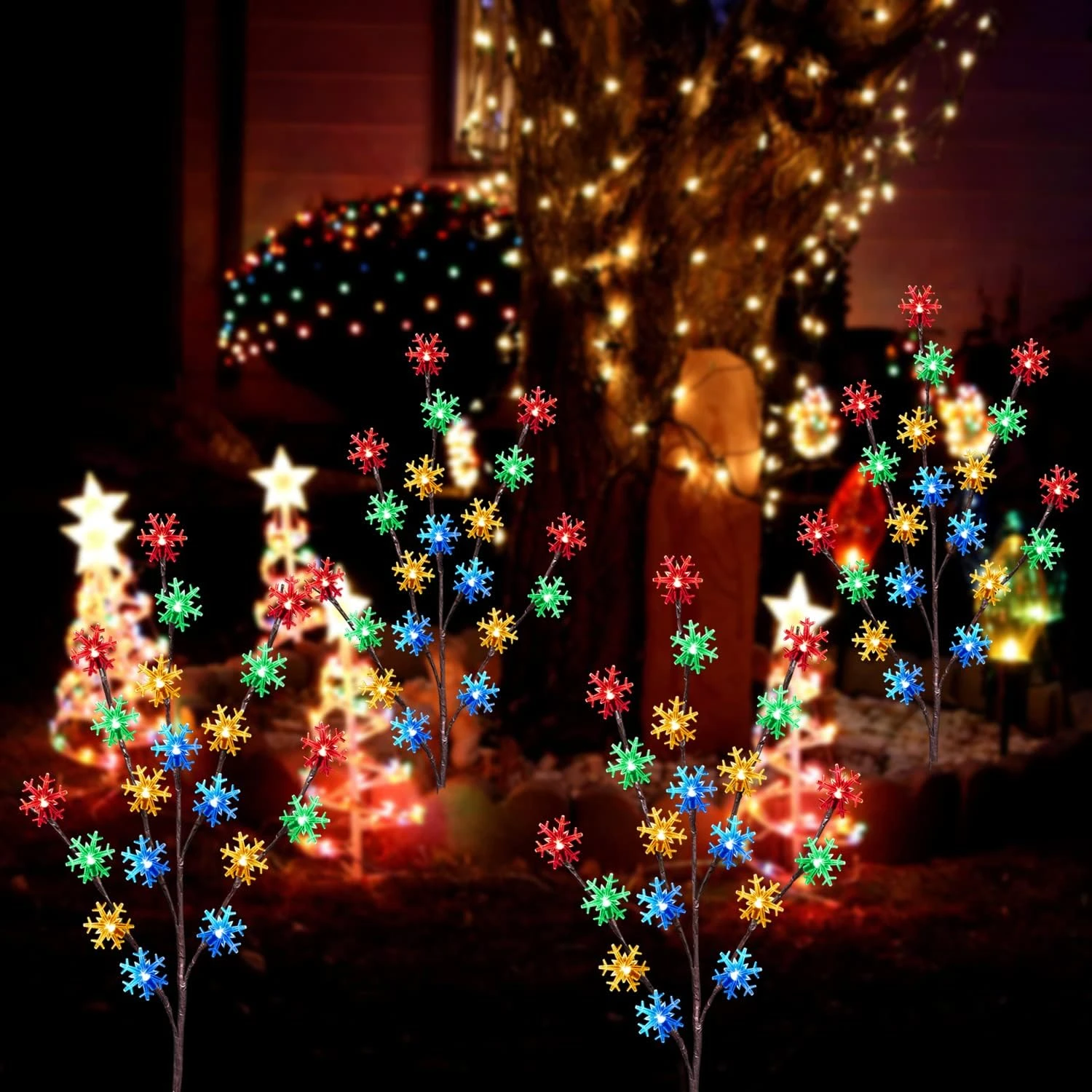 - 【Creative Christmas Stake Lights】These solar Christmas pathway lights are designed in the shape of a tree branch with 20 snowflakes, very colorful and add Christmas festival feeling, creates a beautiful atmosphere and makes your Christmas decor more interesting.