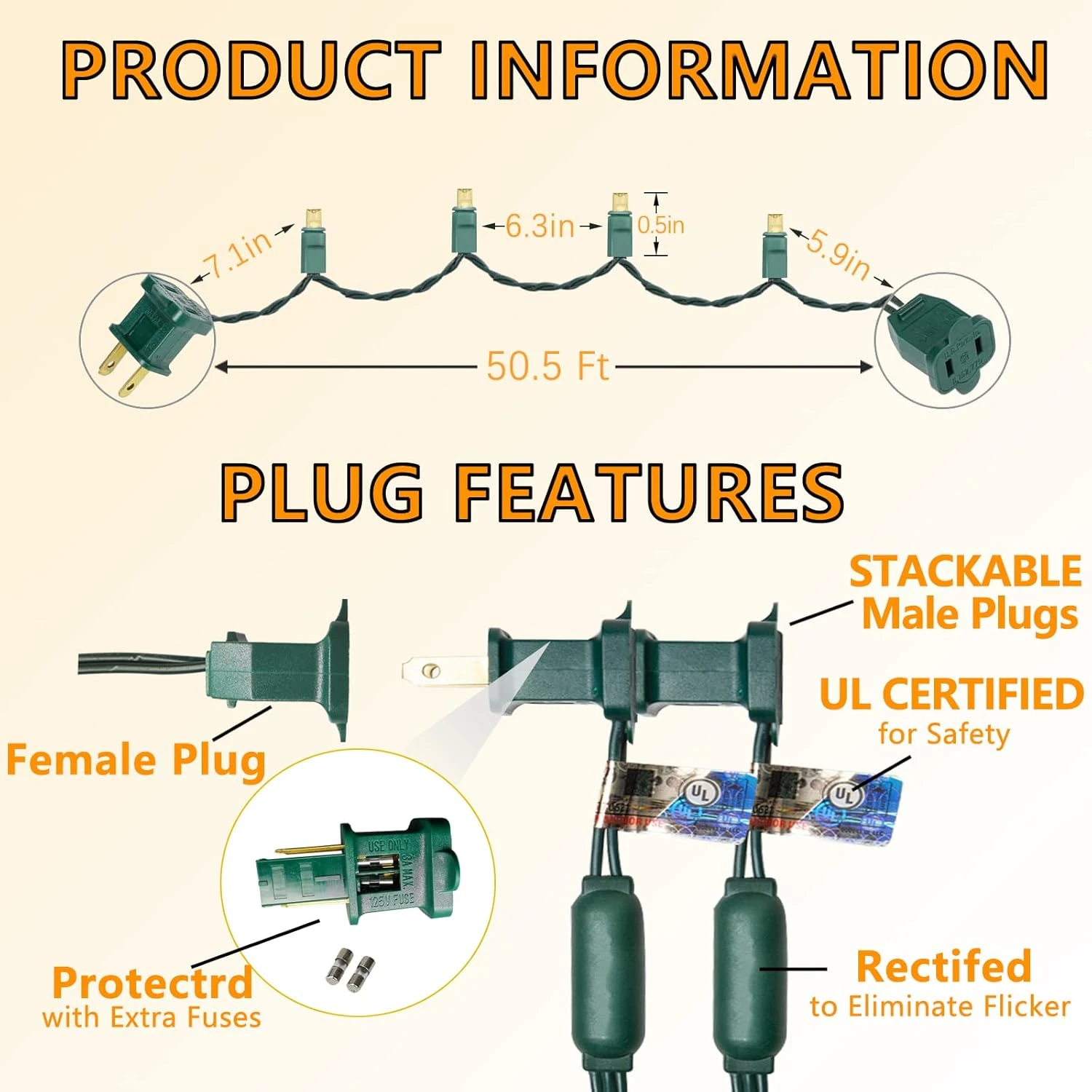 - 💡5mm LED Christmas Lights: 100 counts warm white 5mm wide angle stable LED string lights spaced 6.3 inches apart with green wire. 7.1 inch leads have a stackable male plug and 5.9 inch tails have a female plug for easy end to end connection.