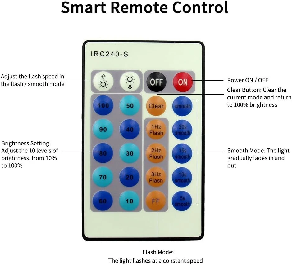 - c- Smart 24 key remote control the fairy lights remotely with 10 brightness levels and 3 different modes – Smooth / flash / Strobe.