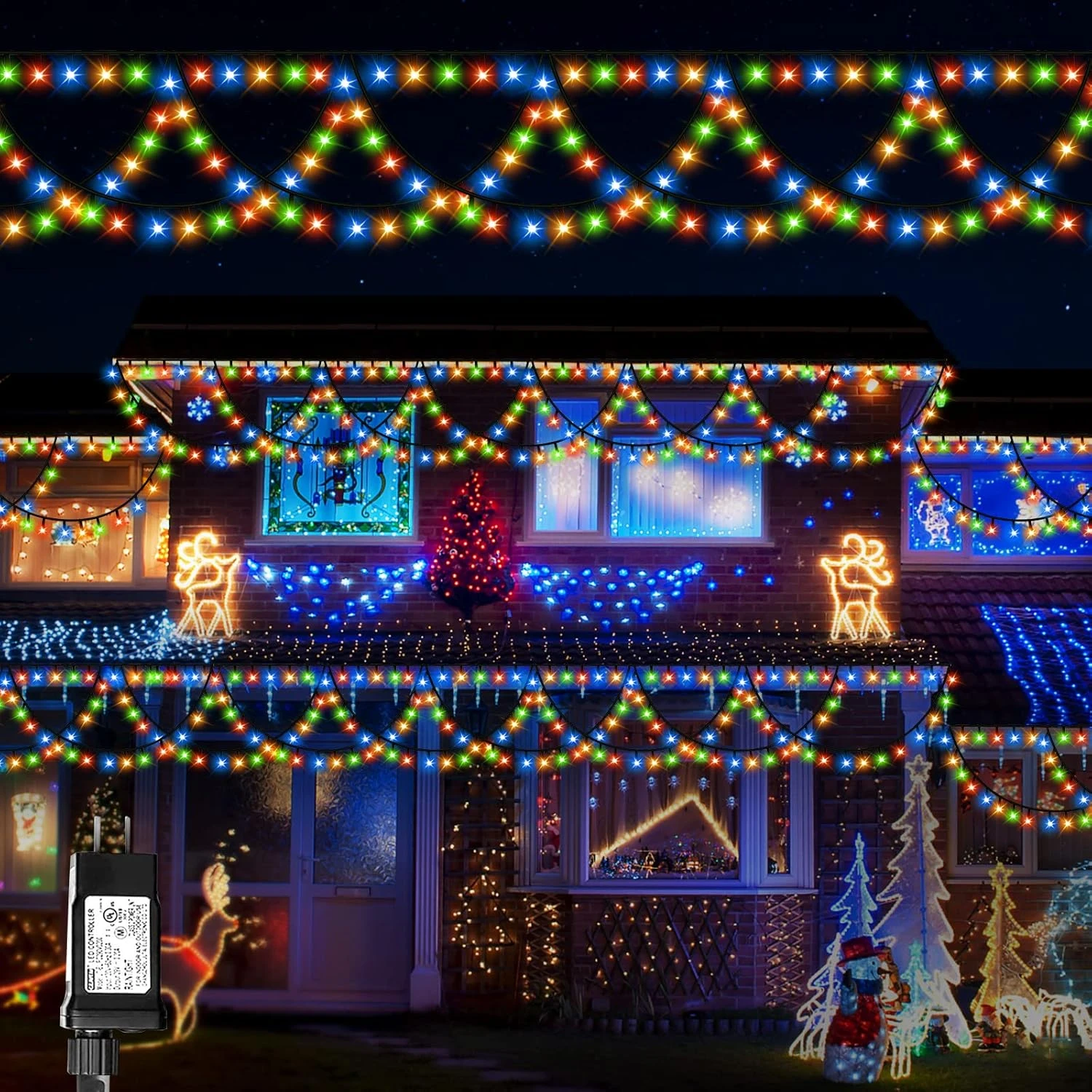 - 【Extendable】The christmas lights outdoor with 40ft length and 19 semicircles and 380 individual led lights. Each Christmas string lights outdoor has end-to-end connection that allows up to 3 light strings connected together to illuminate a wider range. It’s an idea decorations for rooflines, fence, Eaves.