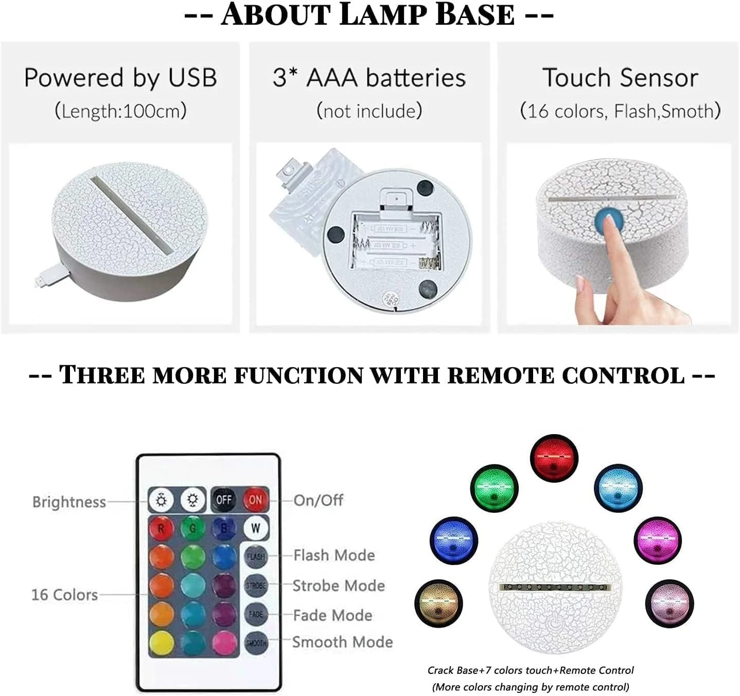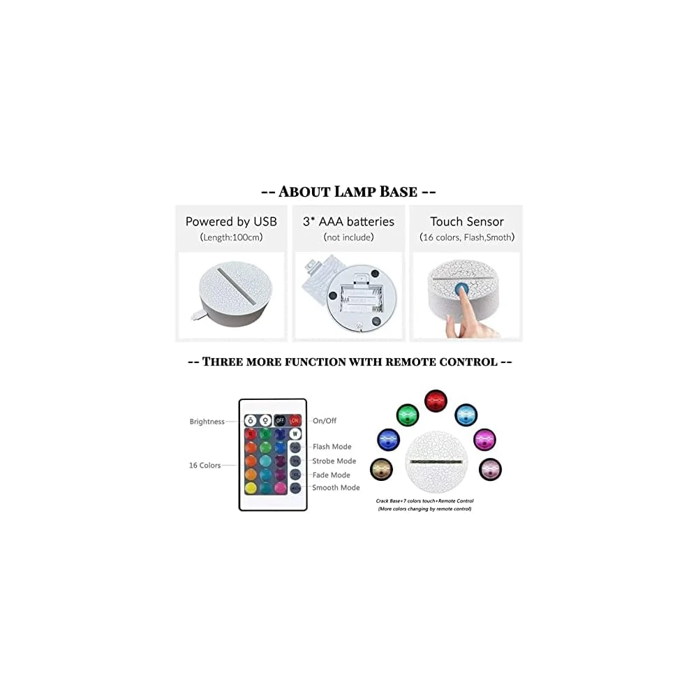 - 【3D Decor Lamp】3D night light comes with 2 Acrylic Plates and 1 ABS night light BaseThe LED base emits colorful light. passes through acrylic glass to ensure a magic 3D illusion. Especially in the dark, the vision thrill will be strong! Perfect for bedroom, bar, shop, cafe, restaurant.dimensional illusion effect makes your room more unique and warm, helping you to sleep better!