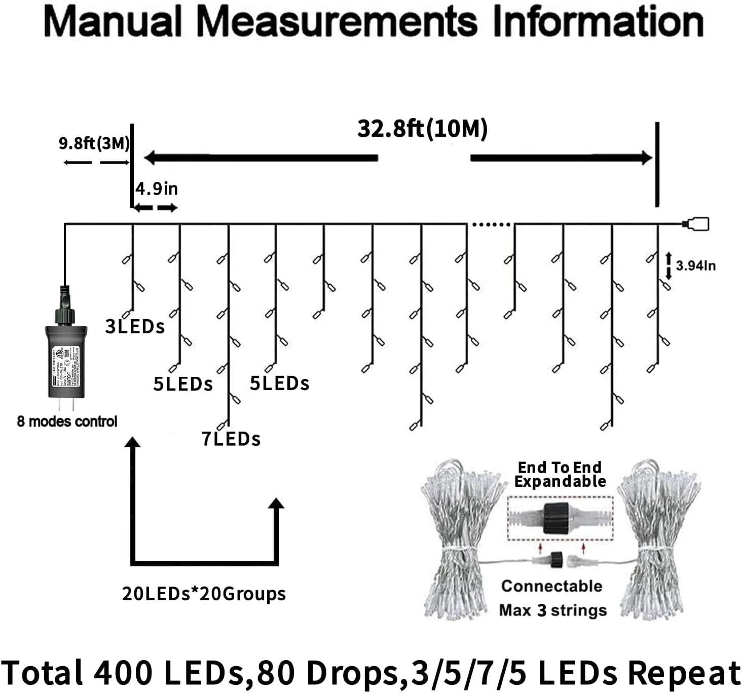 - 🎄【IP44 WATERPROOF & ENERGY SAVING】👍 – Our outdoor christmas icicle lights have passed IP44 waterproof certification. All LED lights are filled with hot melt adhesive layers, anti-freeze and anti-oxidation performance ensure longer life. It is perfect for outdoor use without being damaged, including heavy rain and snow. However, please note that the plug must be protected from water.