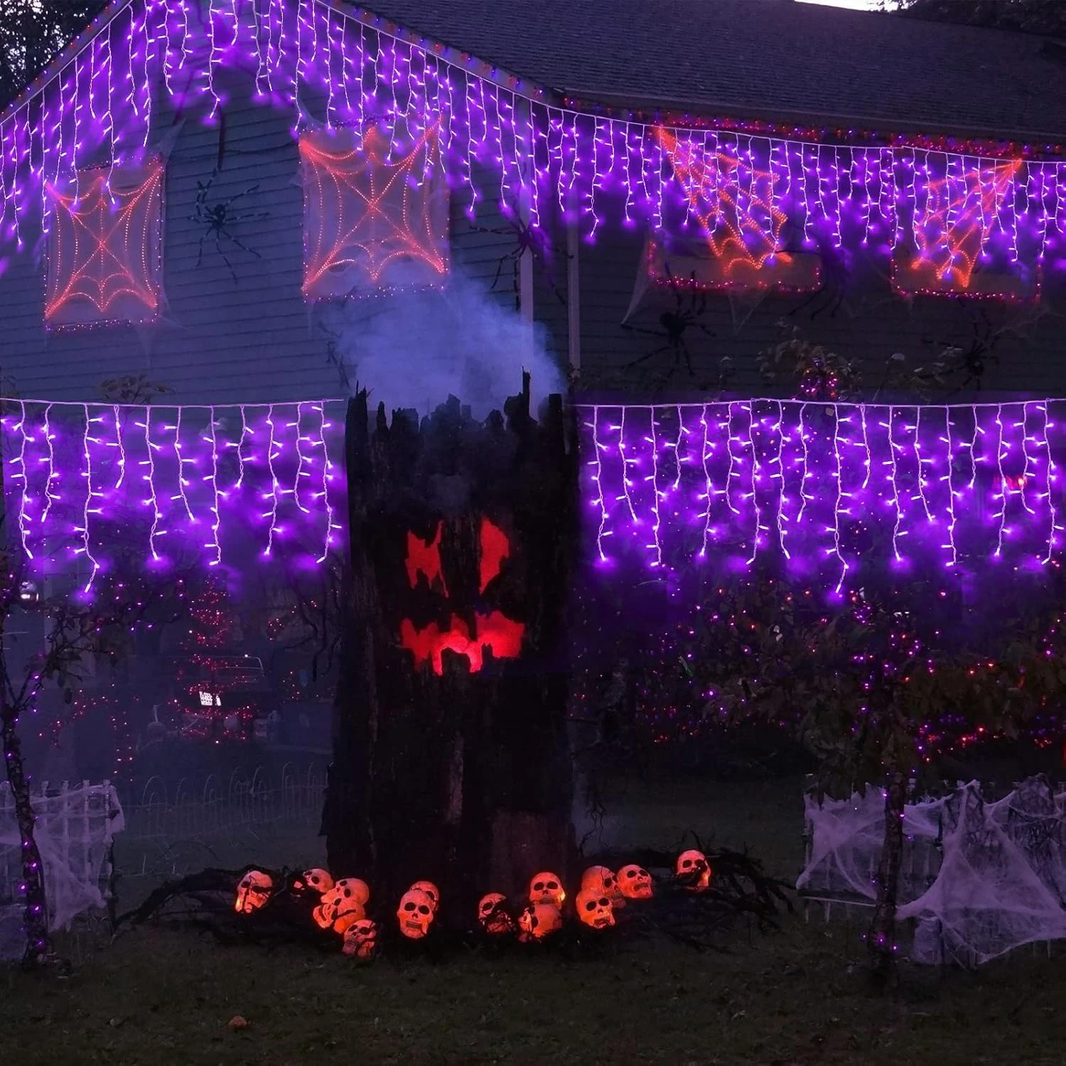 - 🎄【CONNECTABLE HALLOWEEN ICICLE LIGHTS】👍 – Purple Icicle lights with 33ft length and 400 l ED bulbs, 80 drops with four different lengths for a pretty display, You can plug the icicle lights away from where you need it with a 10 foot lead wire. It is connectable, max to 3 set, so can be hung on walls, windows, roof, doors, gazebos, staircases and Christmas trees freely.