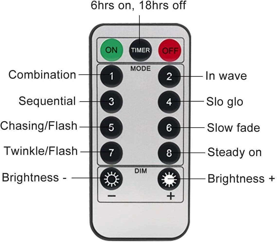 - Remote Control — With a remote in hand, you can easily turn on/off the lights; adjust the brightness; switch from flash to twinkle to slow fade to steady on etc. Control your lights at the distance of 12ft. To avoid forgetting to turn off the lights, you can set timer, the twinkle lights will be 6 hours on and 18 hours off per day. All is in your control!