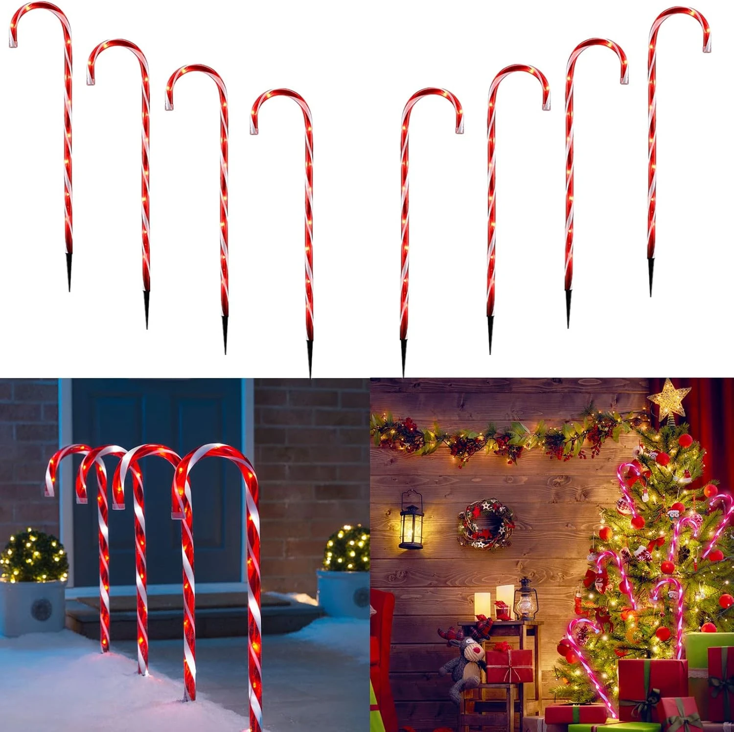 - VOLTAGE and SAFETY – 110V. This set of 8 candy canes with red and white thick plastic cane tubes, red high-quality bulbs LED lights and 6-inch stable ground stakes will brighten your front pathway in a festive fashion.