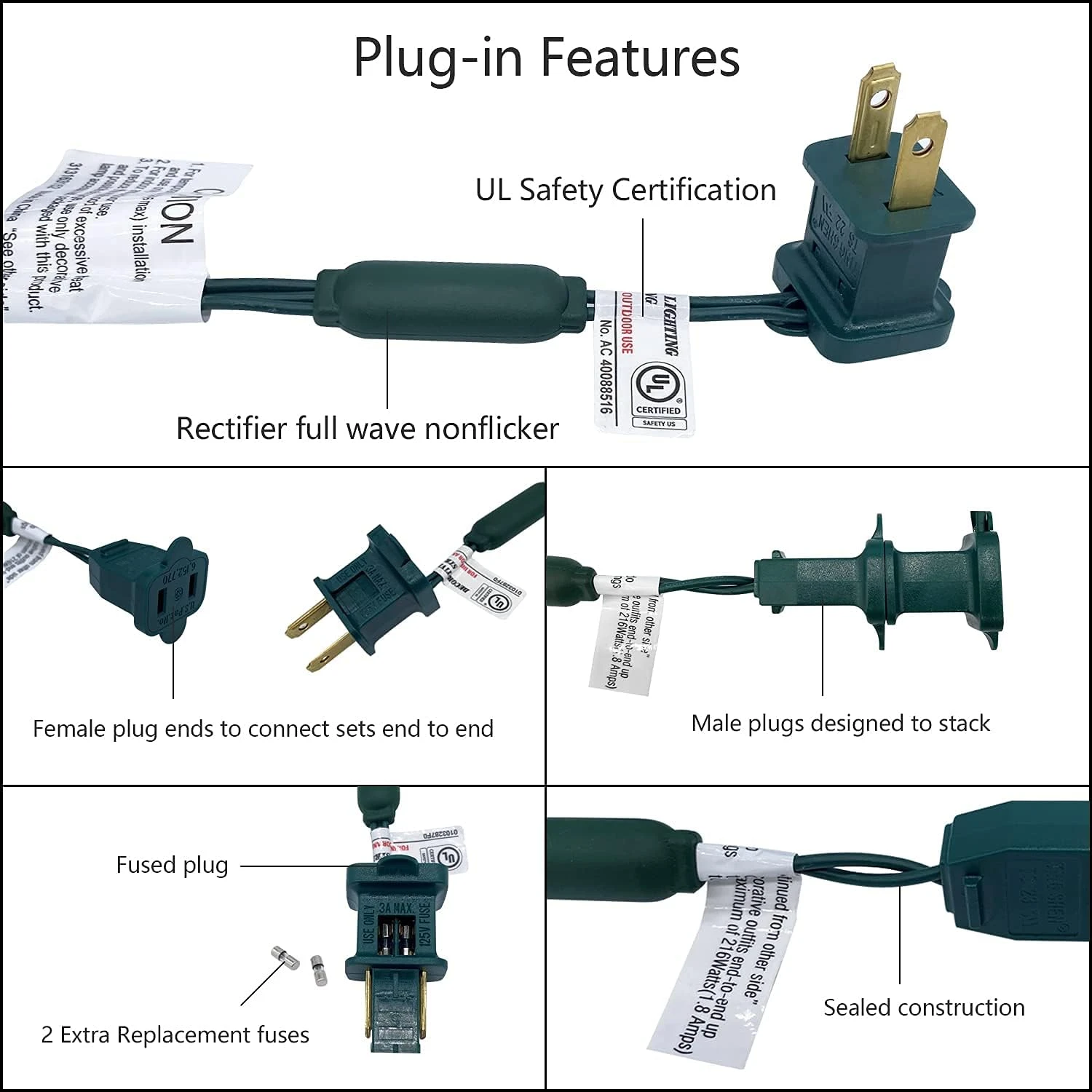 - UL listed and premium quality,LEDs use up to 90% less energy,the led string light is made with a male and female plug and 2 extra fuses for replacements