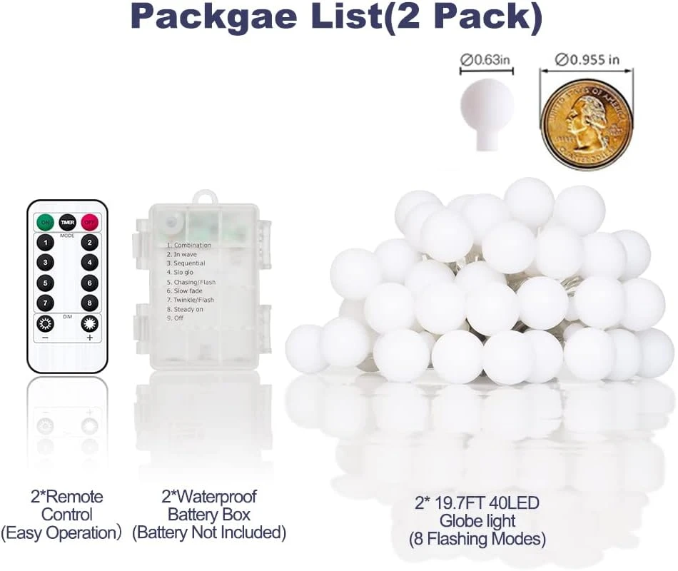 - 【2Pack 40 LED Globe FAIRY STRING LIGHT】 19.7FT/6M Globe fairy lights With 40 Super Bright LED beads, 0.63inch (16mm) bulb diameter.2Pack Globe string lights give off soft warm white to create a warm and wonderful atmosphere, Makes everyone enjoy the best moment, share the happiness and built an unforgettable memory