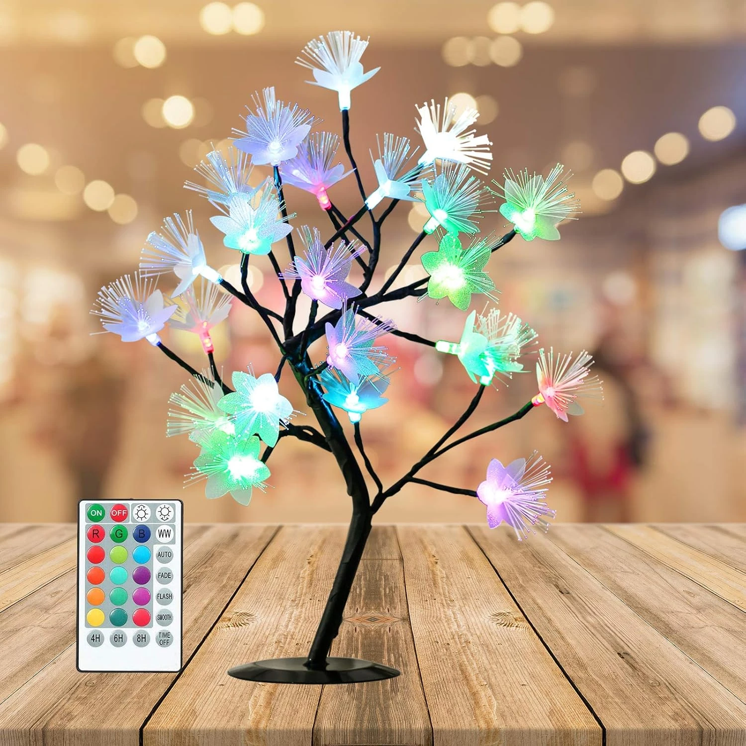 - 【Artificial RGB Fake Twig Tree Light Design】16 color changing RGB fiber optic style design, artificial flower shape light will add more vitality to your home.The table tree lamp with 24 LED lights have 16 different individual colors and multi color that could be remote controlled and adjusted, 4 modes with timer, which makes it all different.